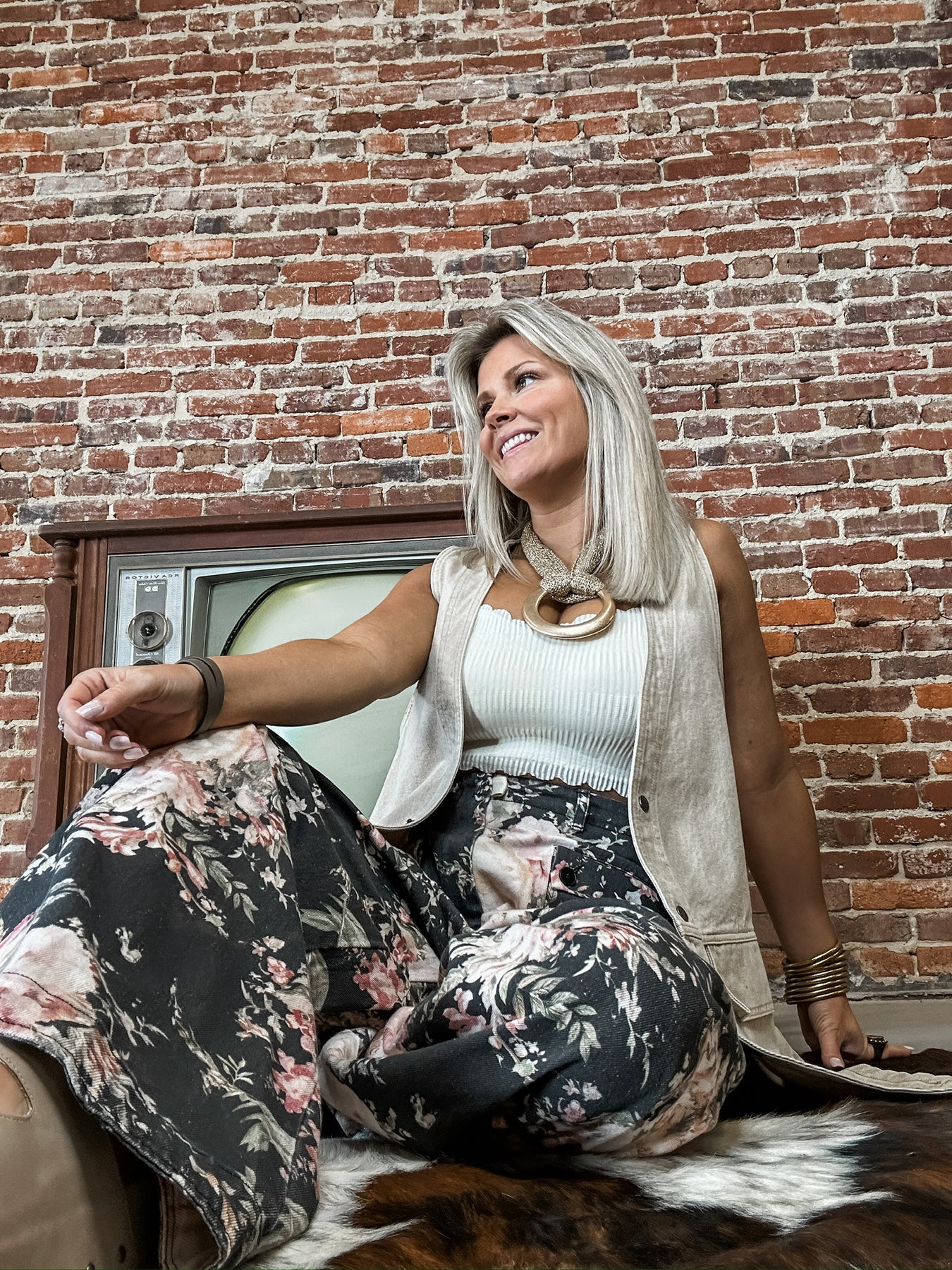 These bottoms are a total statement. High end feel with a denim like texture and the cutest vintage floral print. Designed with a true button and zip closure plus belt loops for a polished touch. Wear them wide leg for a cool, elevated look or cinch the ankles for a laid back jogger vibe. Fun, unique and guaranteed outfit makers. Model is wearing her true size Small with a relaxed fit. Feel free to size down especially if you are inbetween sizes.