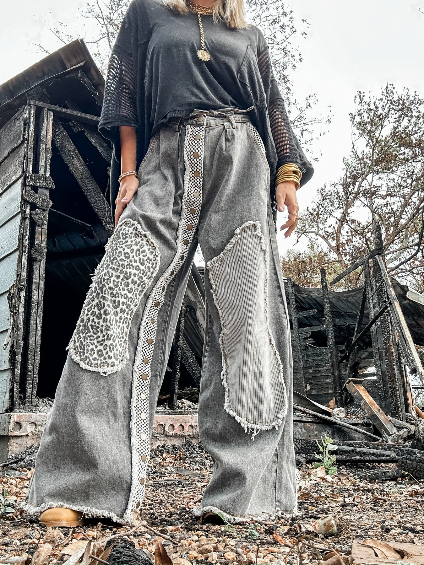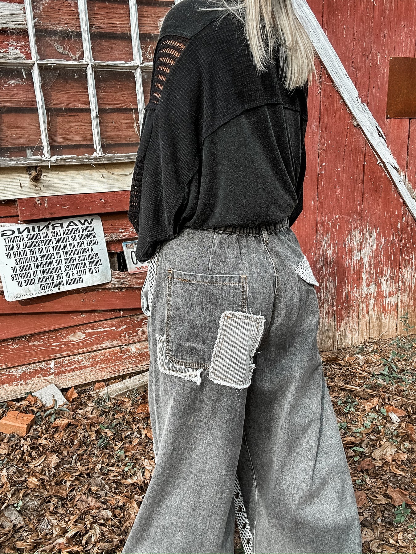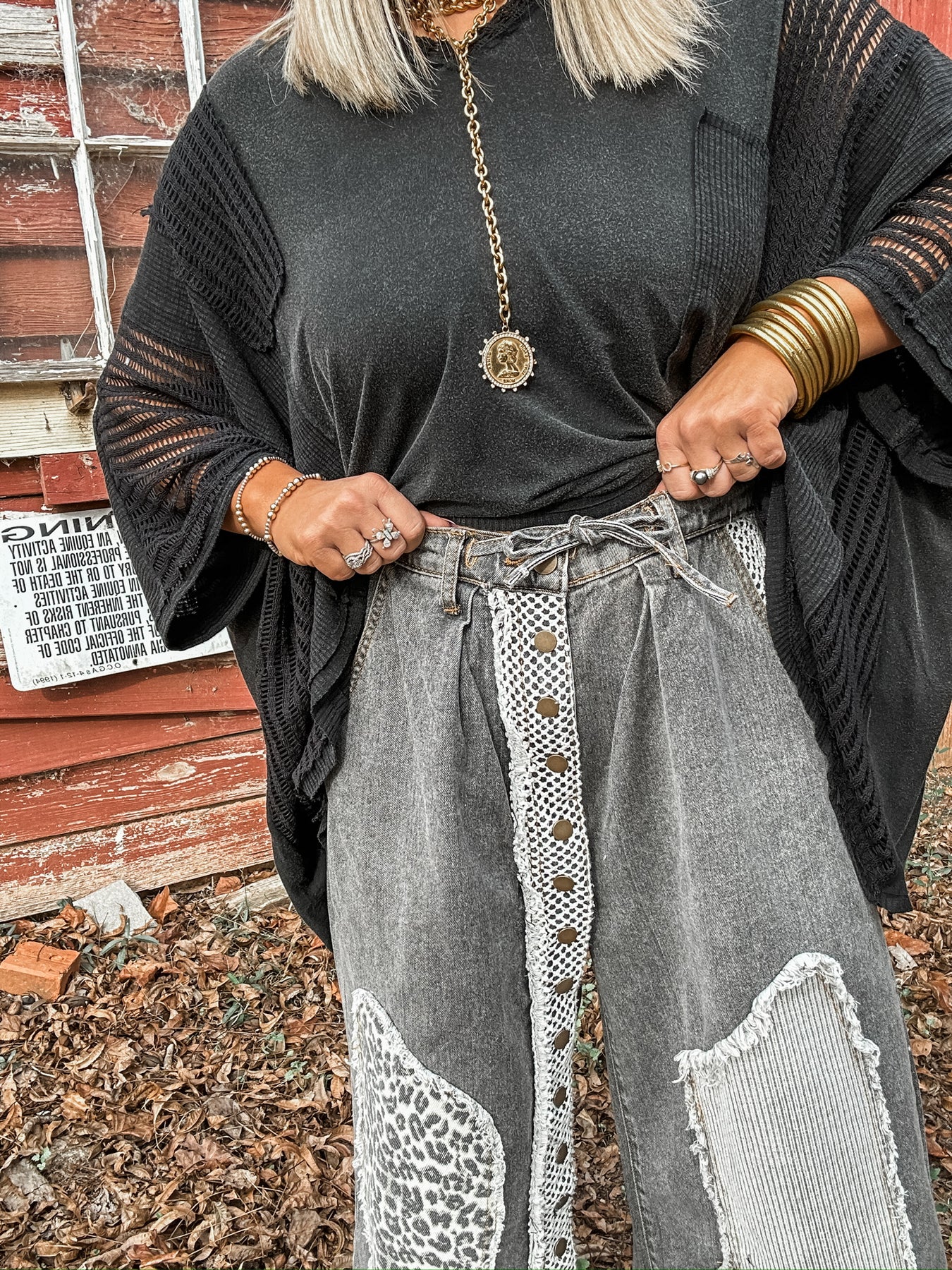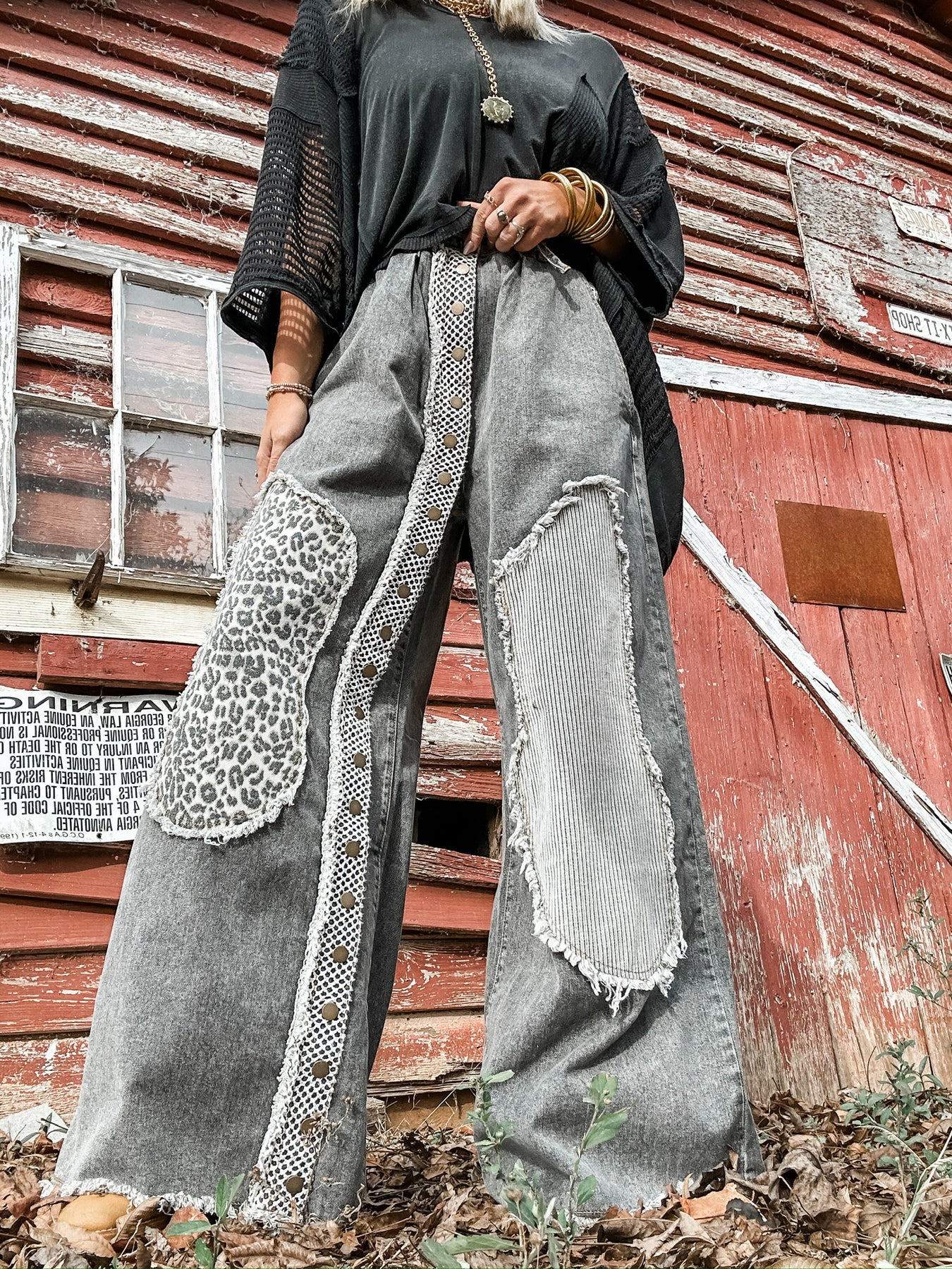 Stand out in style! Black denim wide leg bottoms, designed for the girl who loves those statement pieces. Featuring playful patchwork and button detailing along one leg, these bottoms bring a unique, vintage inspired vibe that HIB fans can’t get enough of. Past releases of this style have been instant sellouts! The true button and zip closure ensures a perfect fit, while the wide leg silhouette keeps things effortlessly comfortable. Bold, comfy and unmistakably unique. Feel free to size down! These do run oversized. Model is wearing her true size Small with an oversized fit.