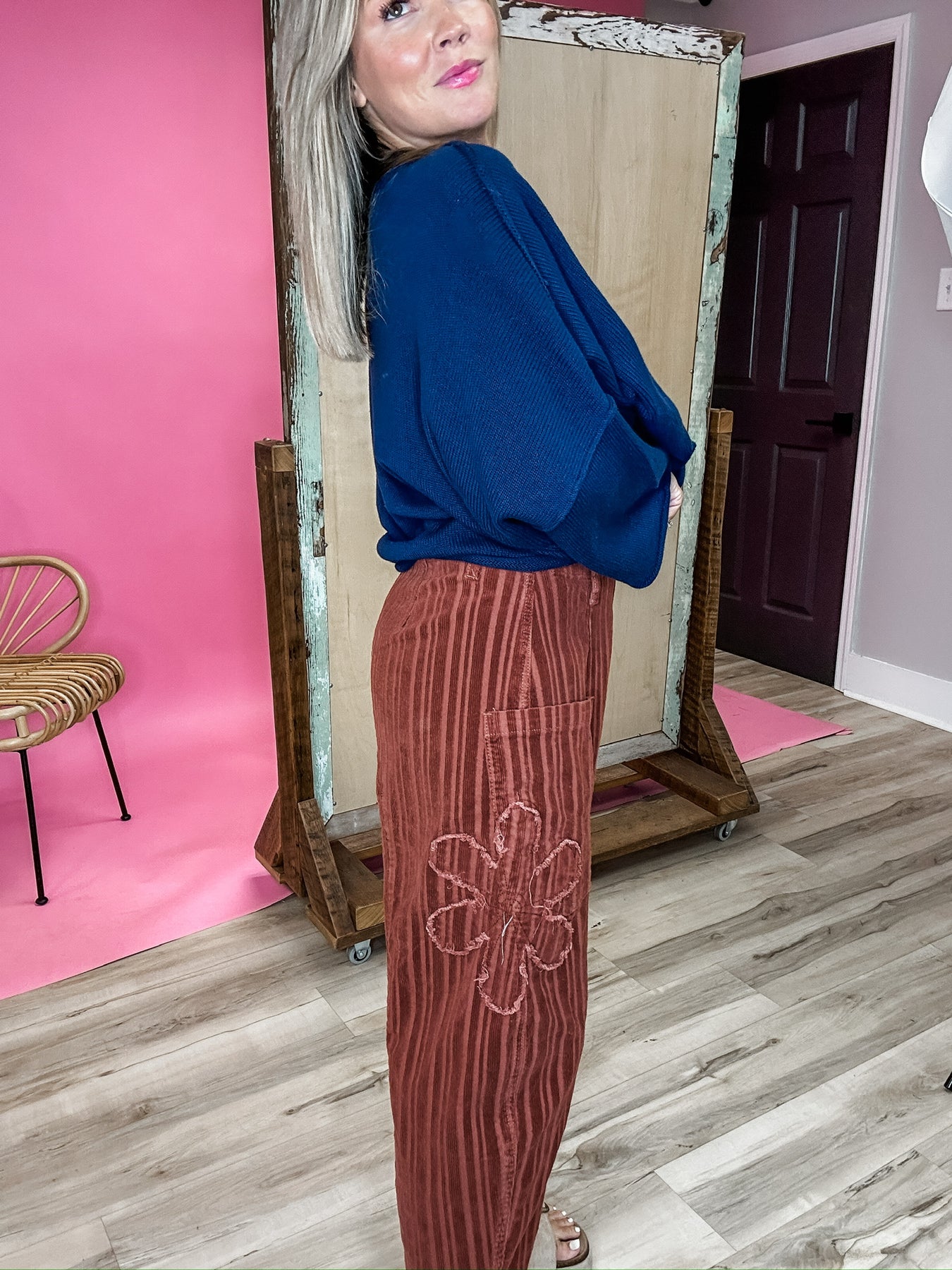 These rust corduroy barrels bring all the Fall vibes! Soft, relaxed, and perfectly textured with playful flower patchwork details. The easy, laid back fit makes them as fun as they are comfortable, while the warm rust shade is a Fall must-have!