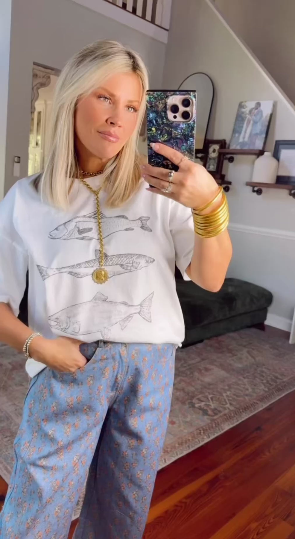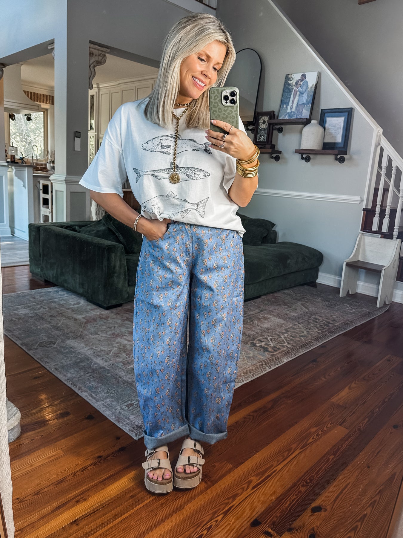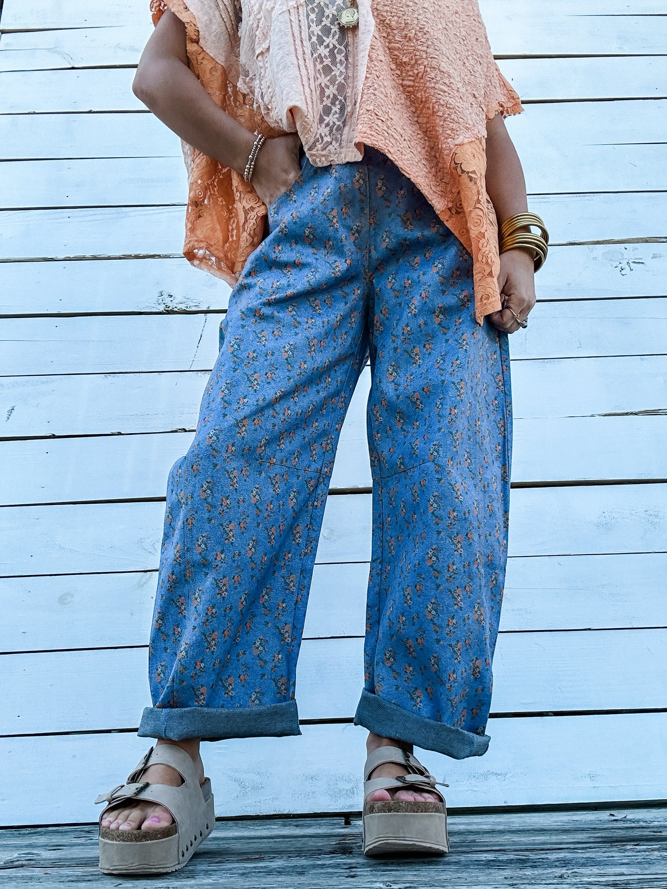 A throwback feel with a modern twist. Soft denim inspired fabric, hints of vintage florals and a bold barrel leg for that laid back, statement look. Model is wearing her true size Small and has them cuffed at hem.