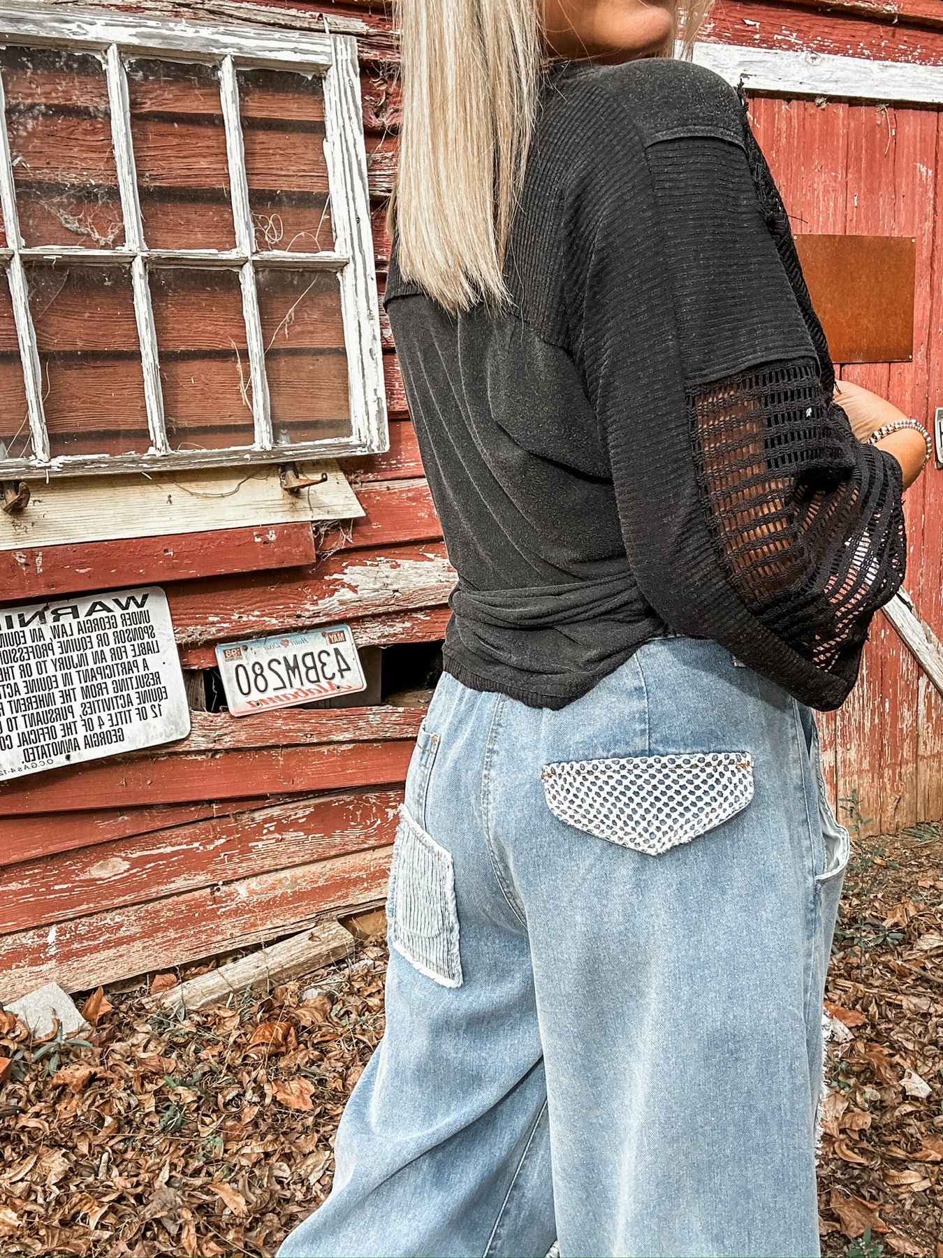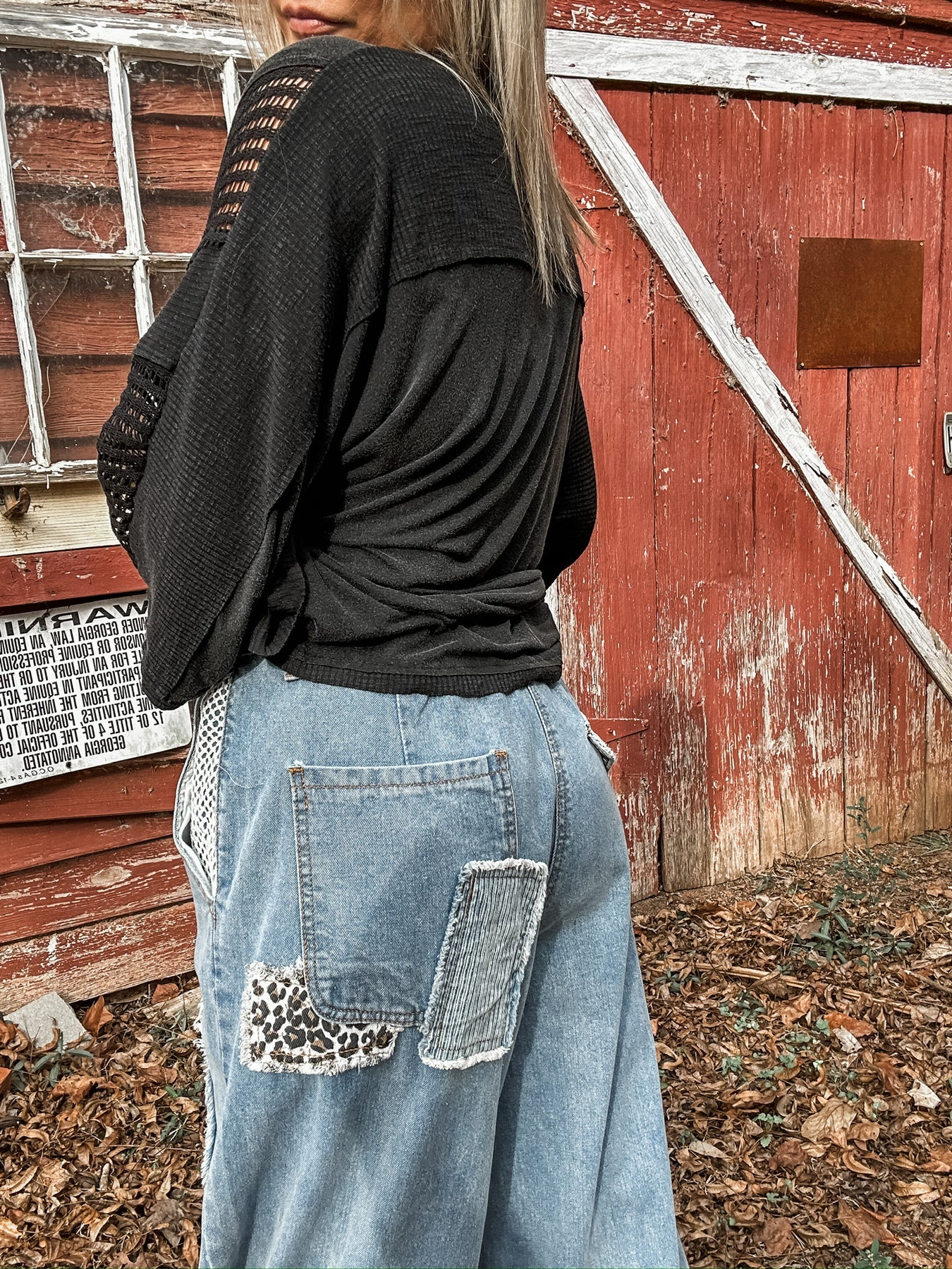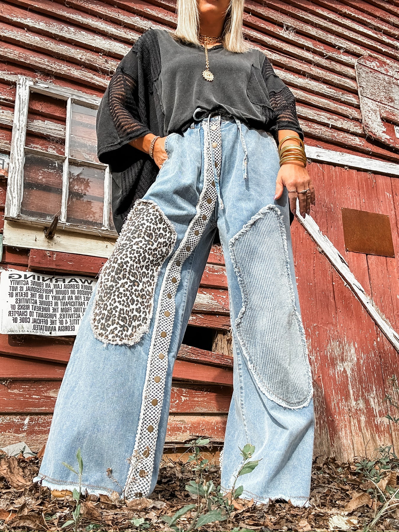 Stand out in style! Denim wide leg bottoms, designed for the girl who loves those statement pieces. Featuring playful patchwork and button detailing along one leg, these bottoms bring a unique, vintage inspired vibe that HIB fans can’t get enough of. Past releases of this style have been instant sellouts! The true button and zip closure ensures a perfect fit, while the wide leg silhouette keeps things effortlessly comfortable. Bold, comfy and unmistakably unique. Feel free to size down! These do run oversized. Model is wearing her true size Small with an oversized fit.