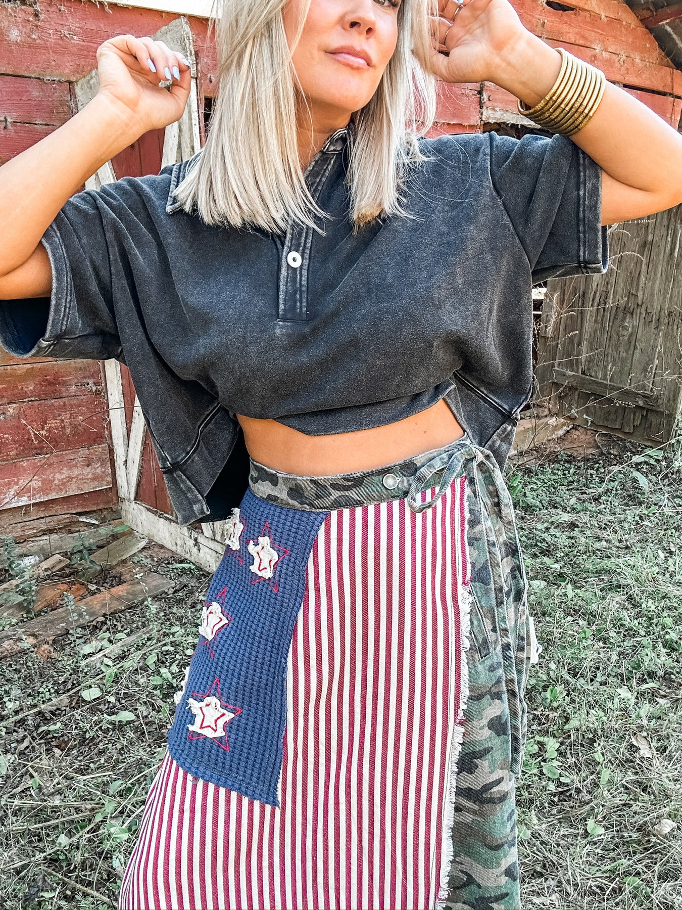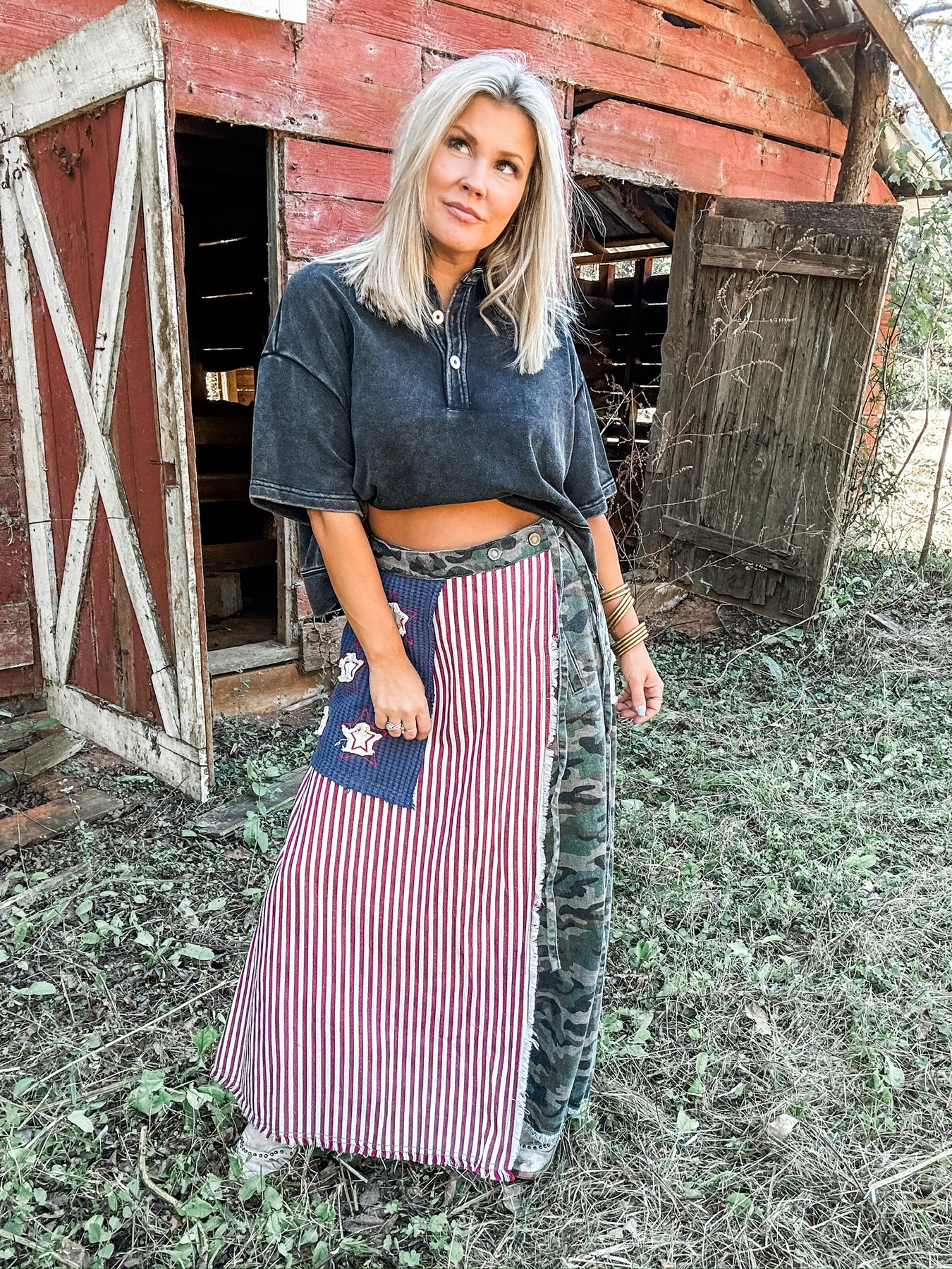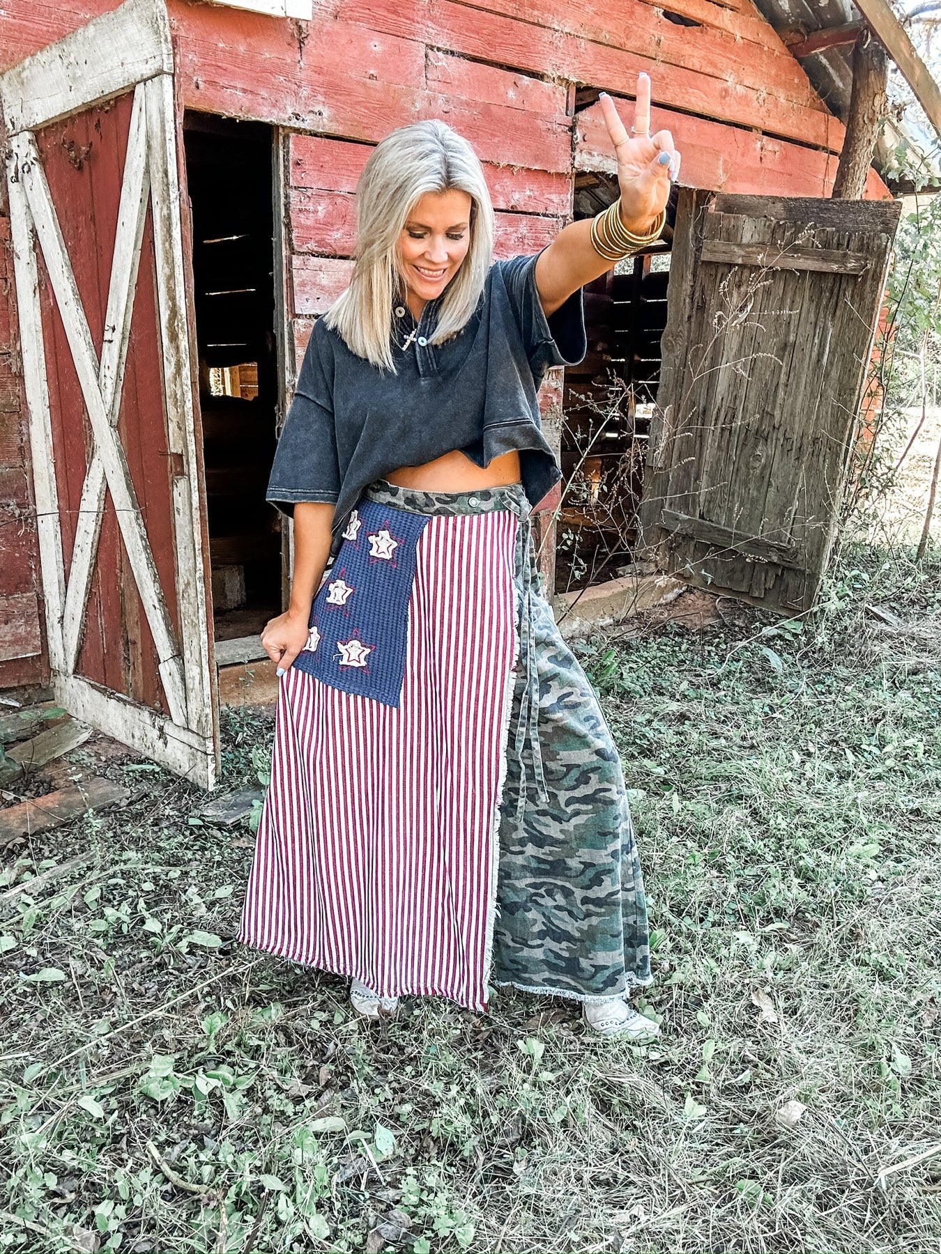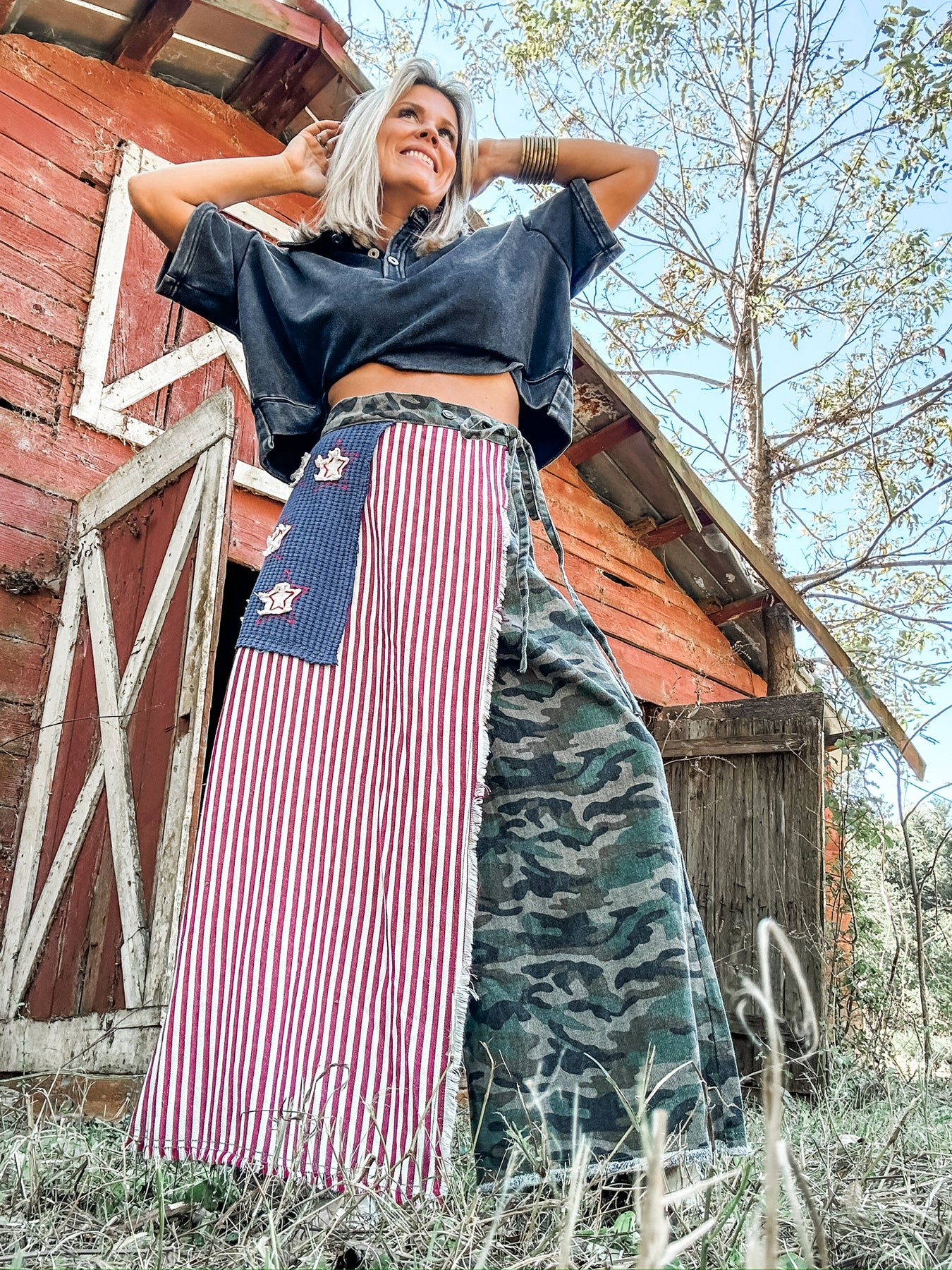 Meet the most unique bottoms yet! Featuring a front overlay that mimics a maxi skirt while the back reveals a wide-leg pant silhouette. A mix of Americana and camo vibes, crafted from textured denim with raw edges and tons of details, these pants are a true statement piece for fearless style. Model is wearing her true size Small with a relaxed fit.