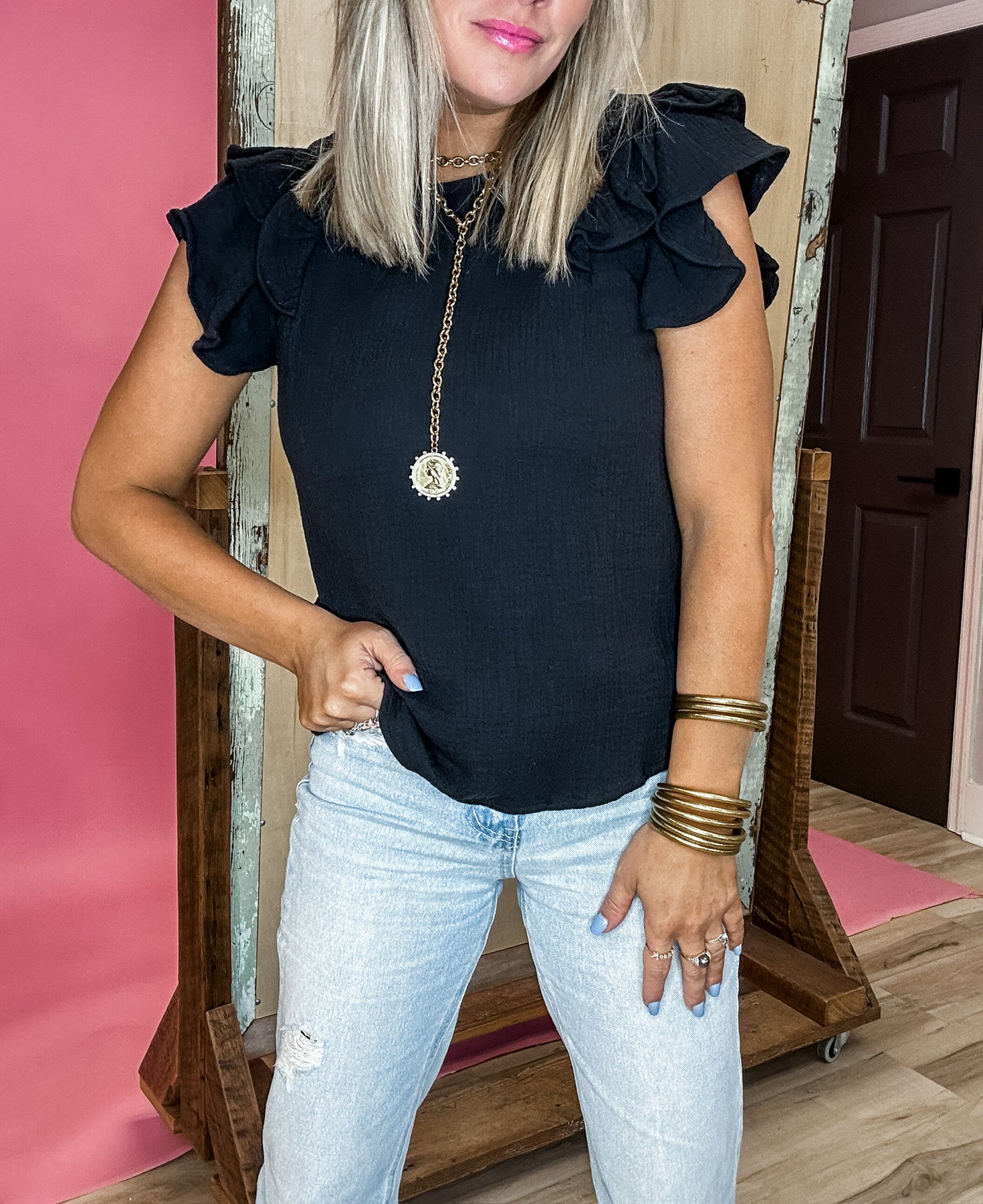 Classic black cotton gauze top with a slight flutter sleeve. A wardrobe basic with just the right touch of flare! Model has a very true to size fit in her true size Small.