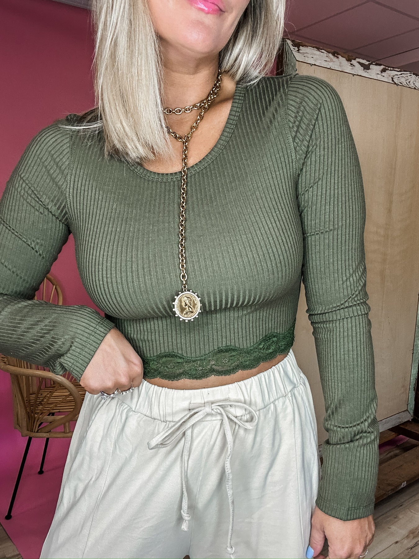 Simple but not boring! This ribbed top has the perfect stretch for layering plus the lace trim ties it all together. Very true to size, but lots of stretch! Model is wearing her true size Small.