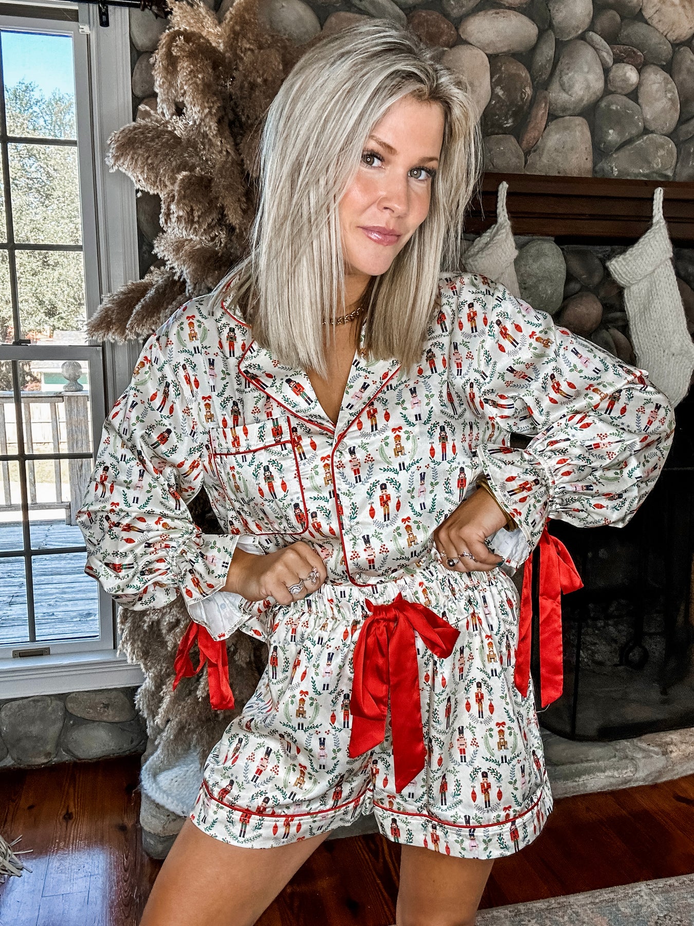 Celebrate in style with these festive satin PJs! Cool to the touch fabric, cheerful Christmas print and belled wrist details make bedtime feel extra special. Matching functional bow at the waist adds the perfect finishing touch! Top notch quality and so comfy. Model is wearing her true size Small with a relaxed fit.