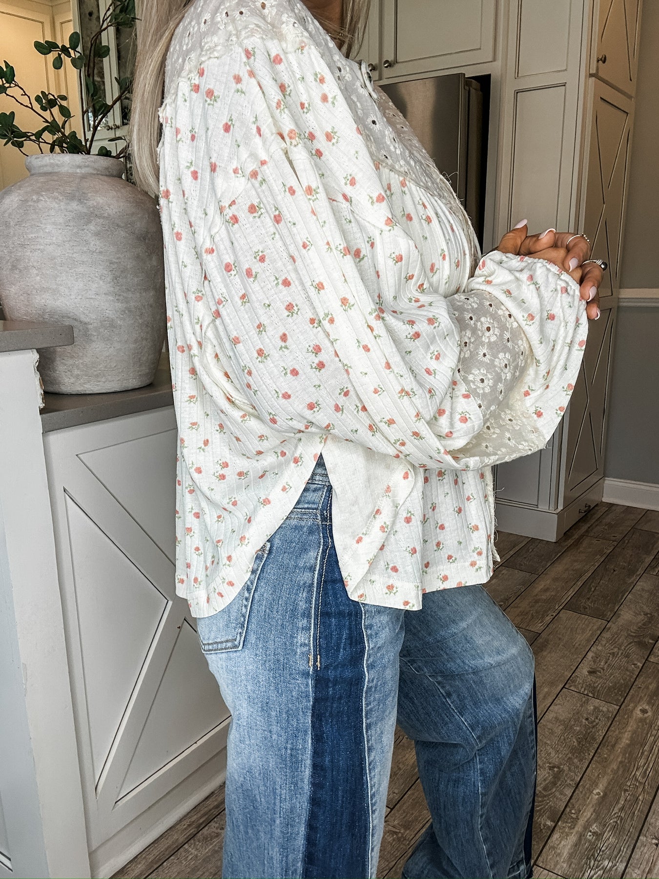 Antique style florals mixed with eyelet details. Flowy fit with oversized sleeves that feel easy and comfy. Button details finish the look. Model is wearing her true size Small with a relaxed fit.