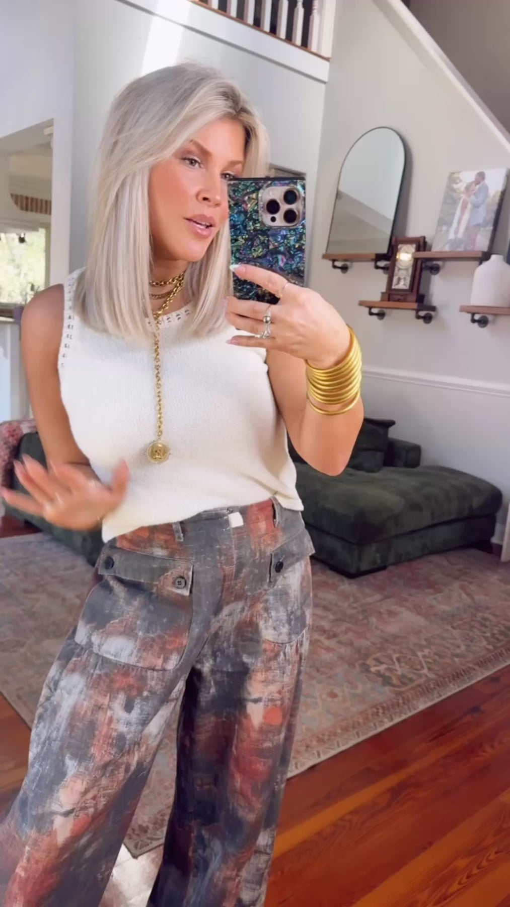 These bottoms are a total statement. High end feel with a denim like texture and the cutest vintage watercolor print. Designed with a true button and zip closure plus belt loops for a polished touch. Wear them wide leg for a cool, elevated look or cinch the ankles for a laid back jogger vibe. Fun, unique and guaranteed outfit makers. Model is wearing her true size Small with a relaxed fit. Feel free to size down especially if you are inbetween sizes.