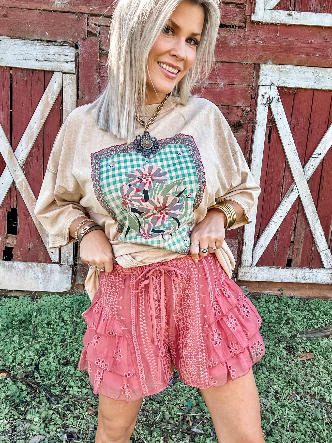 Navy lace shorts with a pretty ruffle detail and a flared fit! Finished with an elastic waistband for all day comfort. Easy to dress up or keep casual. Model is 5'2" and is wearing her true size Small.