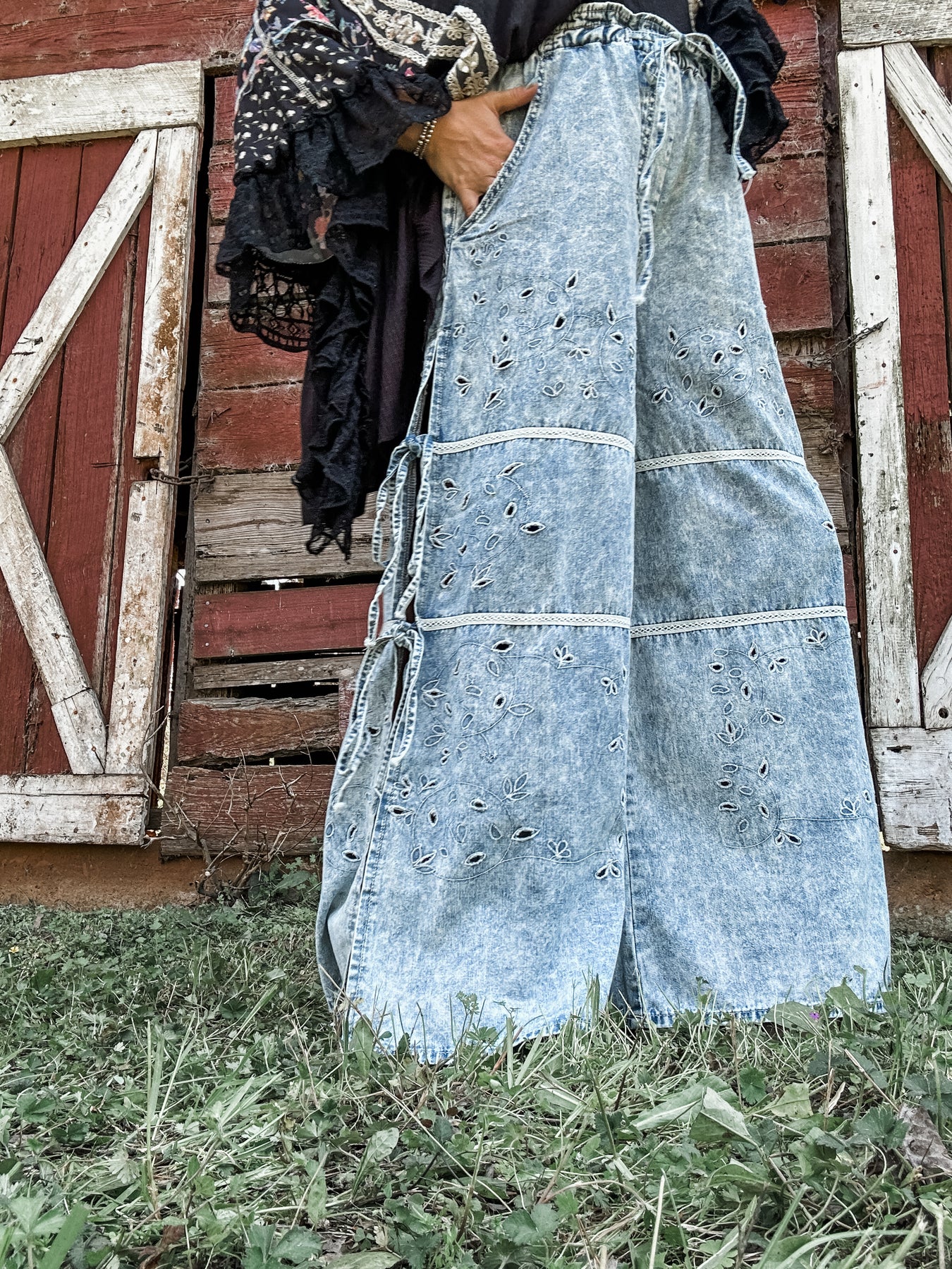 Relaxed, effortless and full of detail. These wide leg denim pants feature soft mineral wash fabric with eyelet cutouts and side tie peekaboo details. Elastic waist keeps them comfy while the fit stays easy and laid back. Total statement but still so wearable. Model is wearing her true size Small with a very relaxed fit.