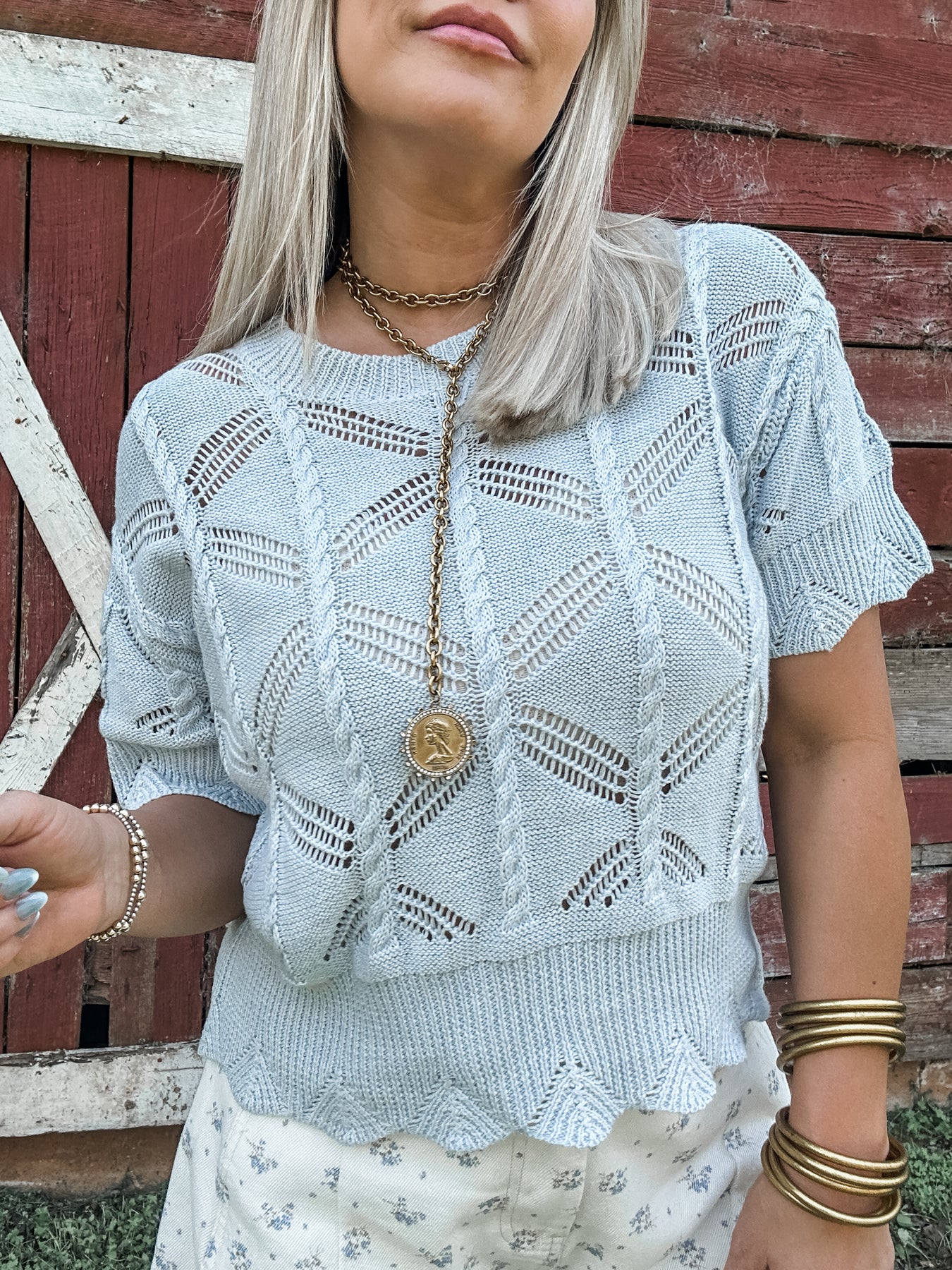 Baby blue crochet pointelle knit sweater with the sweetest scalloped edge detail. Soft, airy and full of texture with a delicate vintage feel. Model is wearing her true size Small.