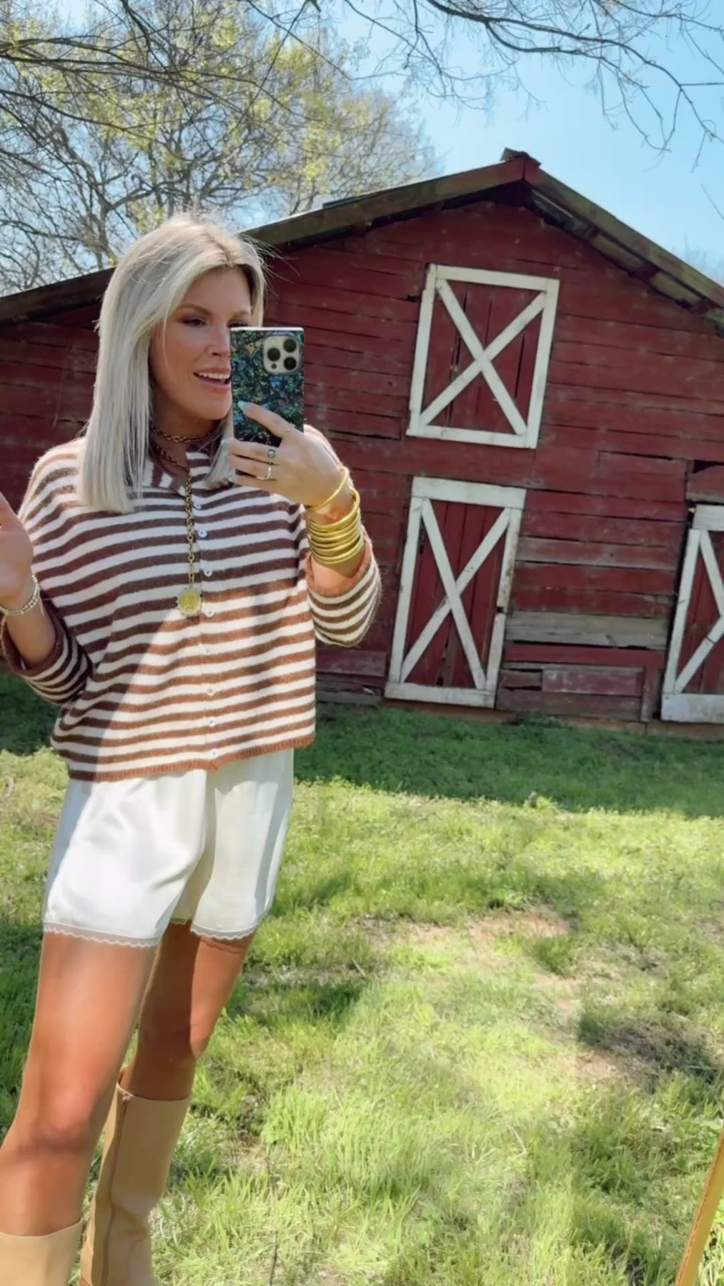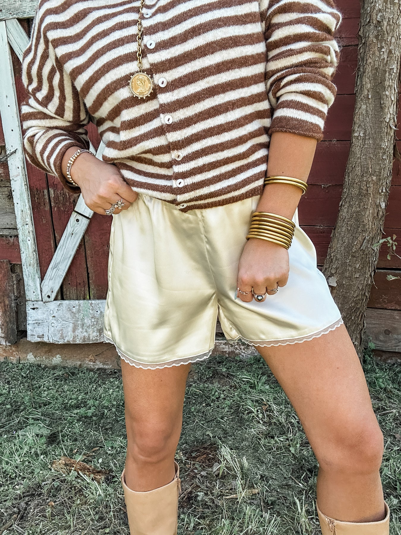 Satin cream shorts with the prettiest dainty lace trim for a soft feminine touch. Lightweight and flowy with an easy elastic waistband. These are so fun to style with a simple top or graphic! Model is wearing her true size Small.