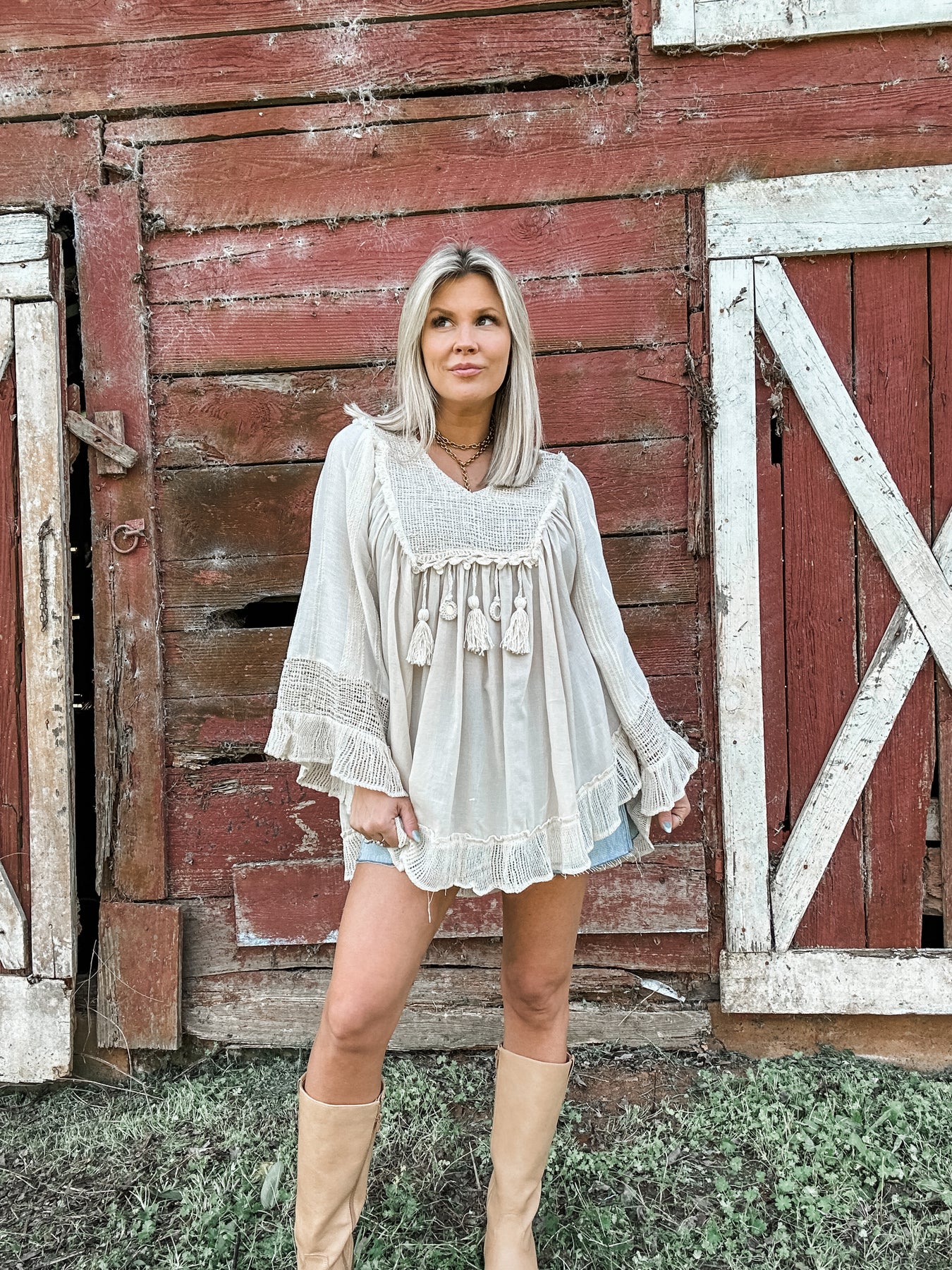 Flowy tunic length top with tassel details that add movement and texture. Rich, layered feel with all the little details that give it that true boho vibe. It's easy, elevated and full of personality. Model is wearing her true size Small with a very relaxed fit.