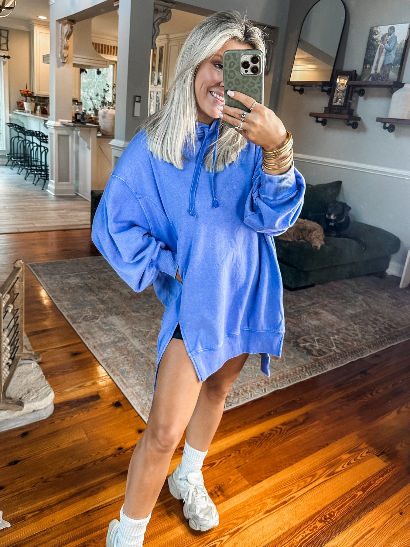 Very relaxed and oversized hoodie with an easy, throw on fit. Finished in a mineral wash for that soft, lived in feel that we love! Designed with dropped shoulders, a cozy hood with drawstring detail, side slits and a longer length for extra comfort and coverage. Effortless, comfy, and perfect for everyday wear. This is one of those pieces you’ll reach for again and again. Feel free to size down 1-2 sizes. This style is made to fit oversized. Model is wearing her true size Small with a very relaxed fit. She has it layered over biker shorts.
