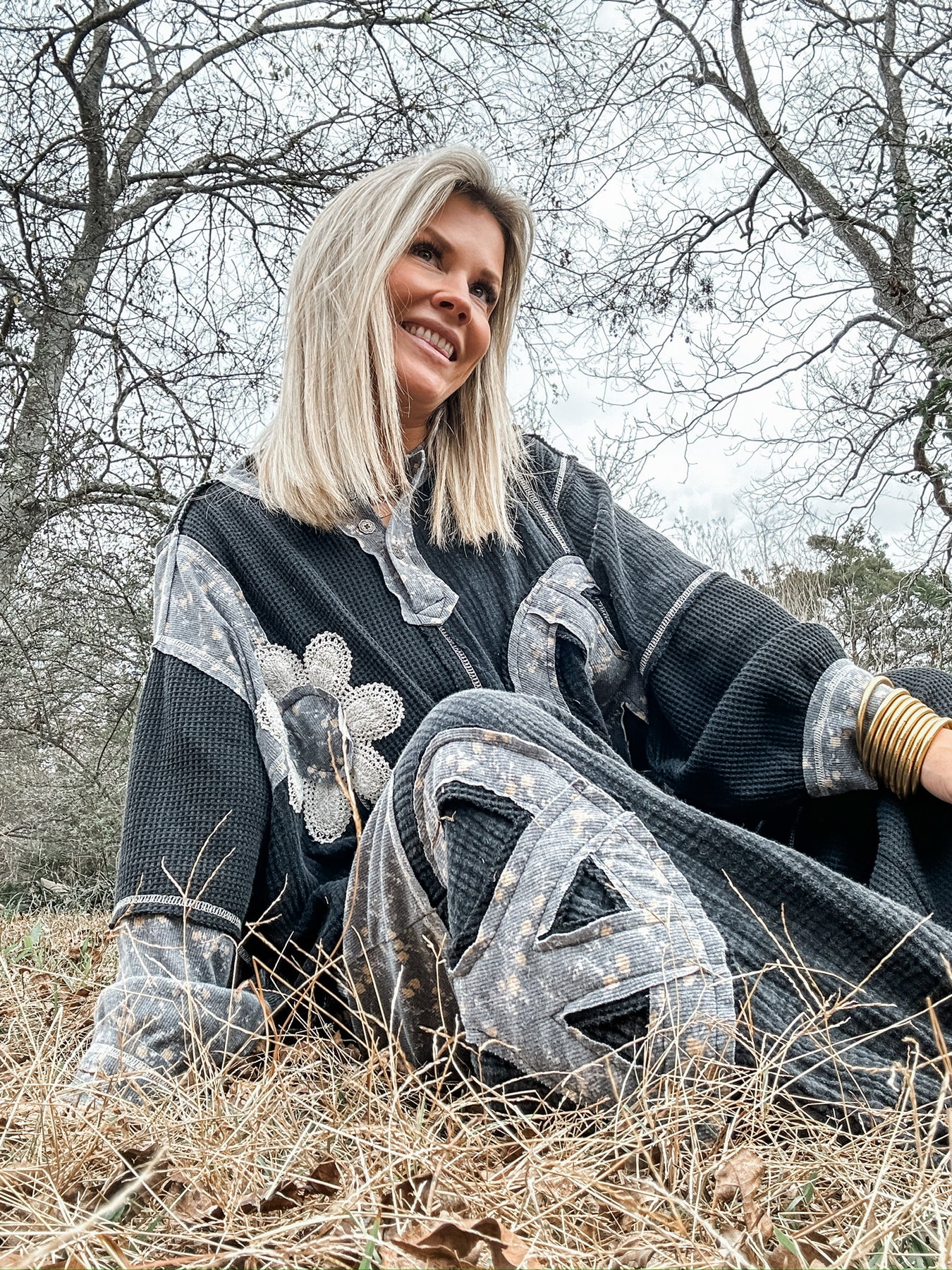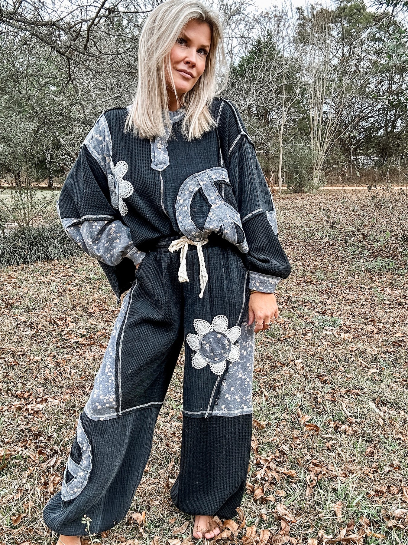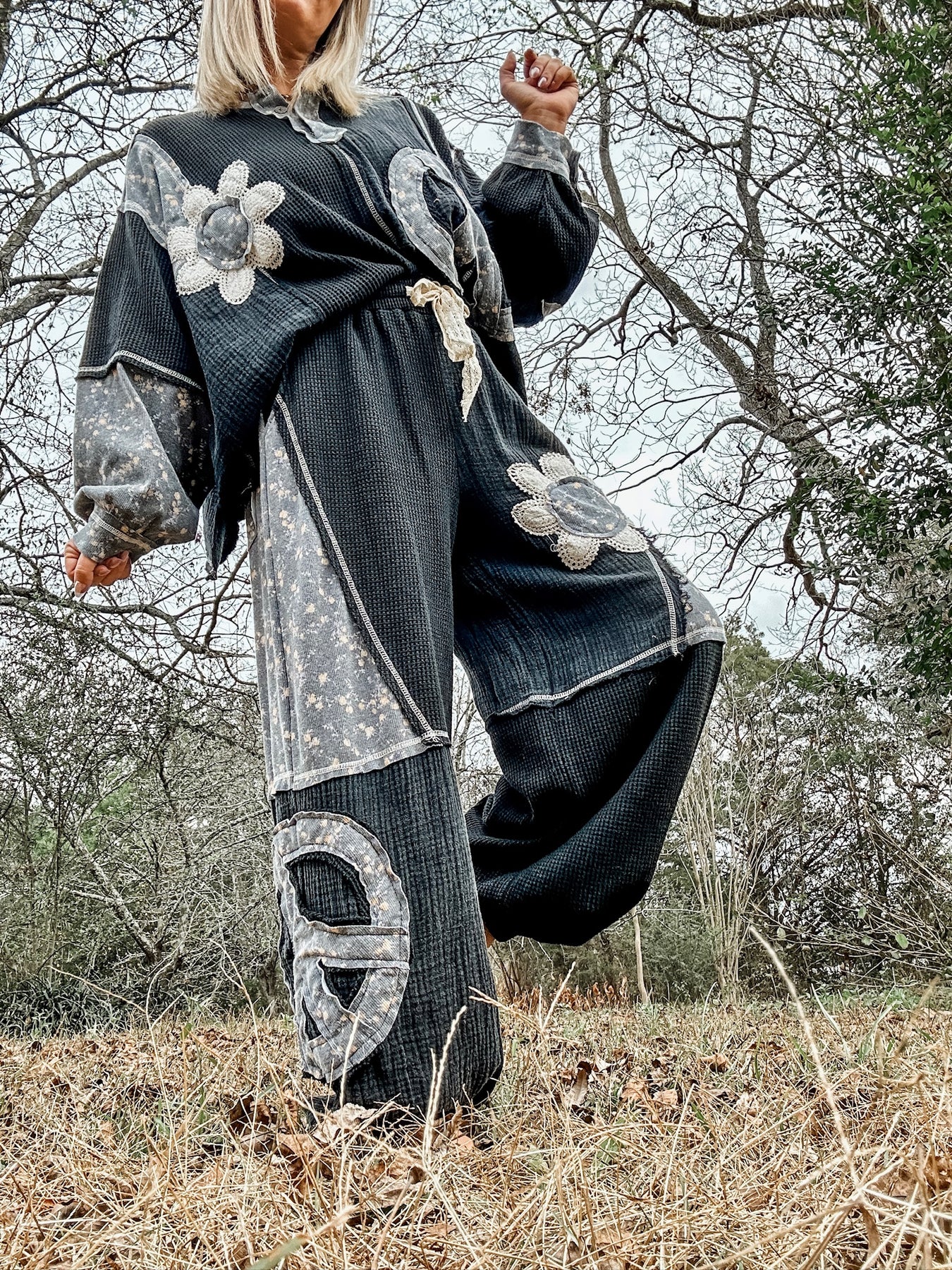 Charcoal mineral wash set with a perfectly worn in feel! Each piece is sold separately, but together they create the ultimate lived in look! Textured patchwork details and raw, rough cut edges give this set its signature edge. Easy, cool and effortlessly styled! The bottoms have a jogger style with elastic band along the ankles. Drawstring waist and super comfy fit. Model is wearing her true size Small with a very relaxed fit.