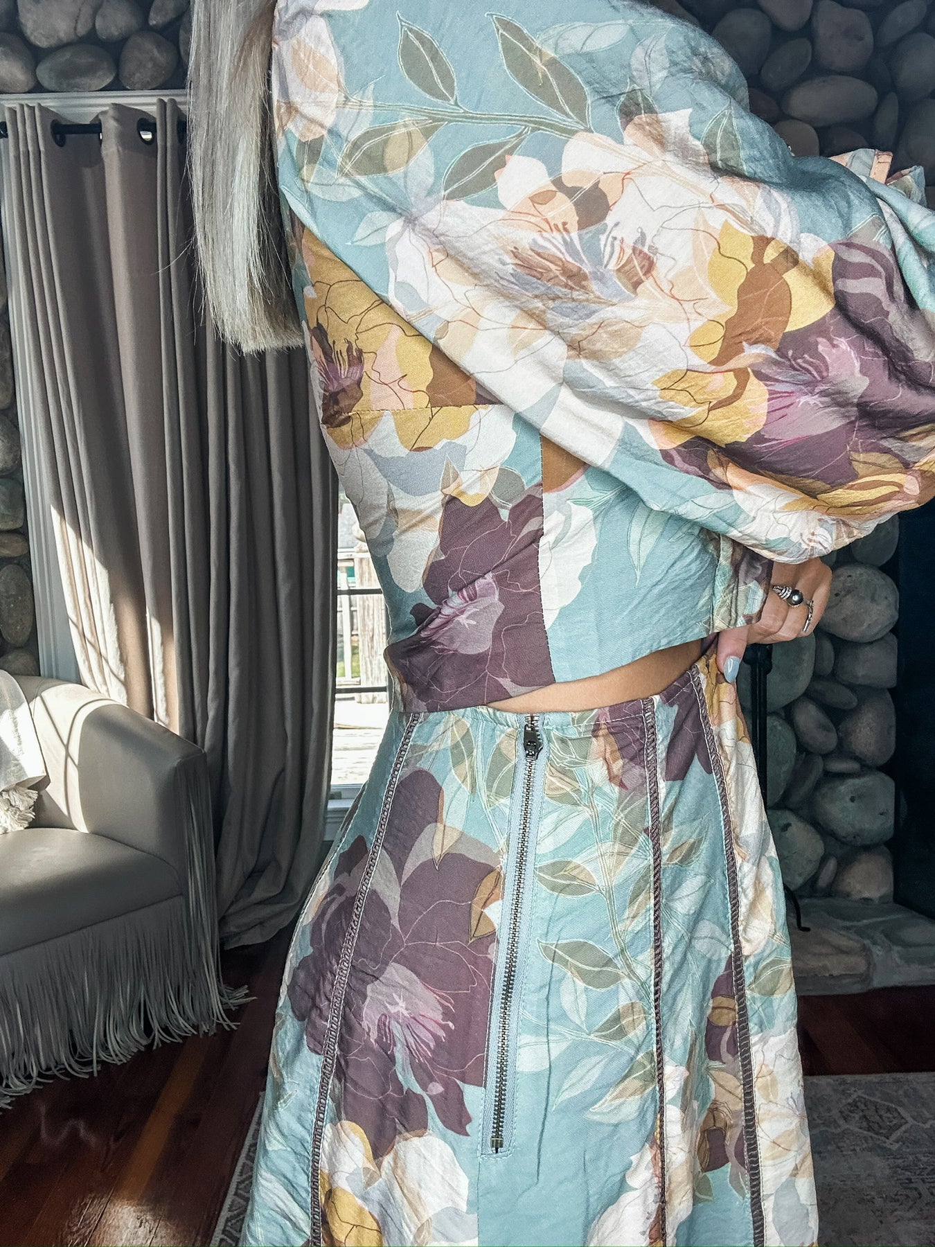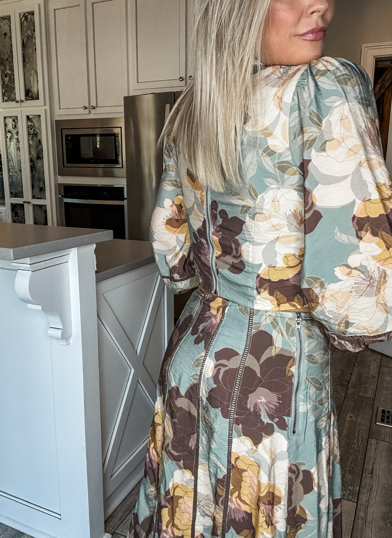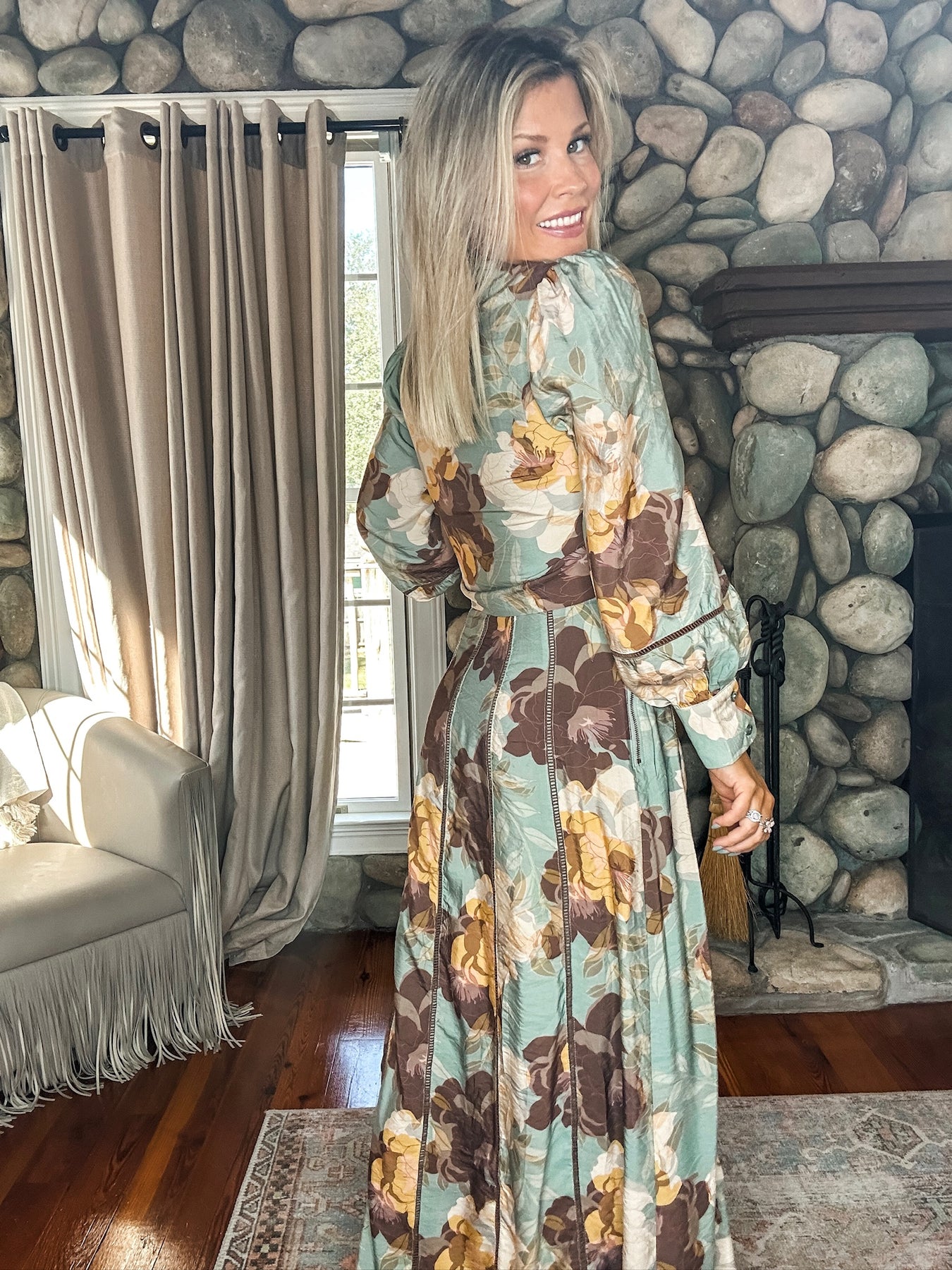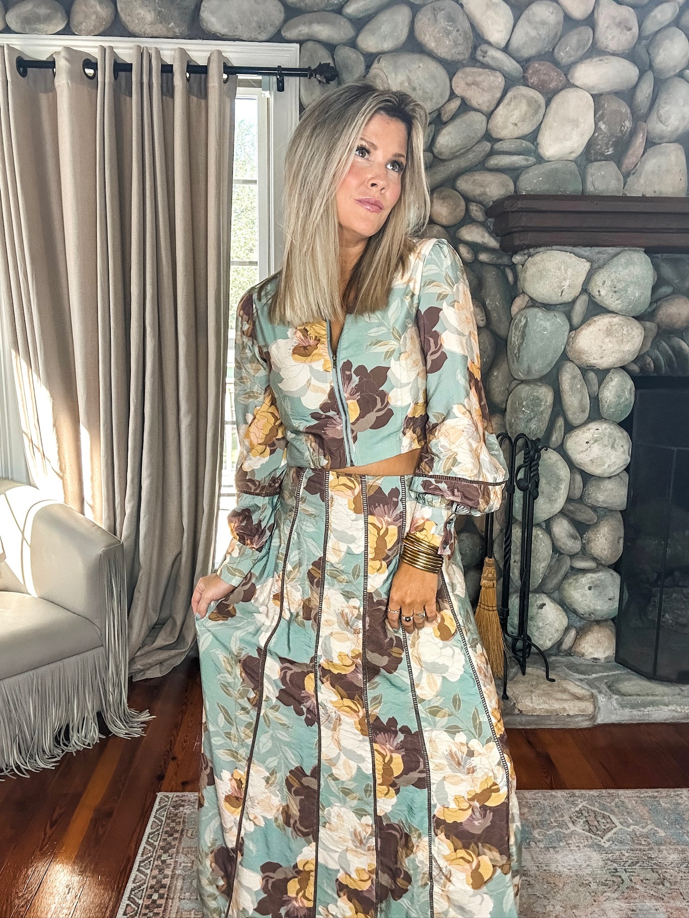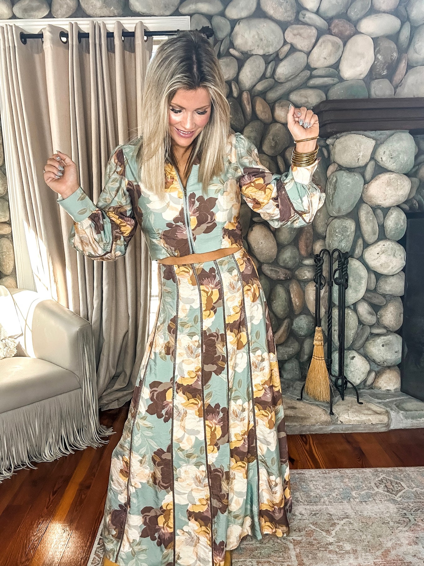 A Fall floral dream! The flowy pleated maxi skirt and matching top create a timeless set with effortless charm. We styled the top 2 different ways! Switch it up-wear it to the front or back! Perfect for family pictures, Fall gatherings or a day you want to feel special. Model is wearing her true size Small with a true to size fit.