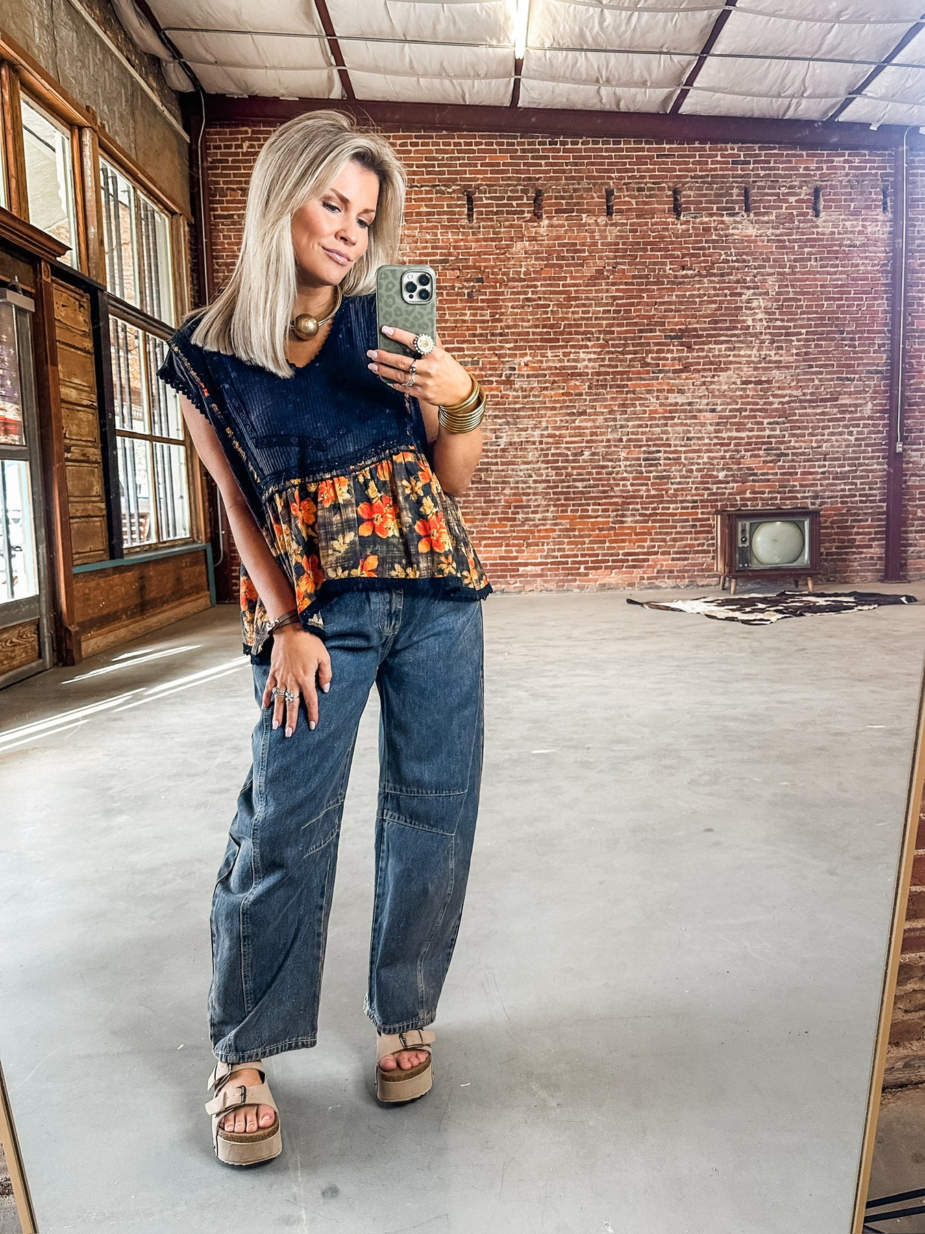 Black top with a soft peplum shape and a flattering V-neck, finished with a pop of floral details for a pretty contrast. Lightweight with added texture that gives it an easy, boho inspired feel. Flowy, comfortable and simple to style. Model is wearing her true size Small.