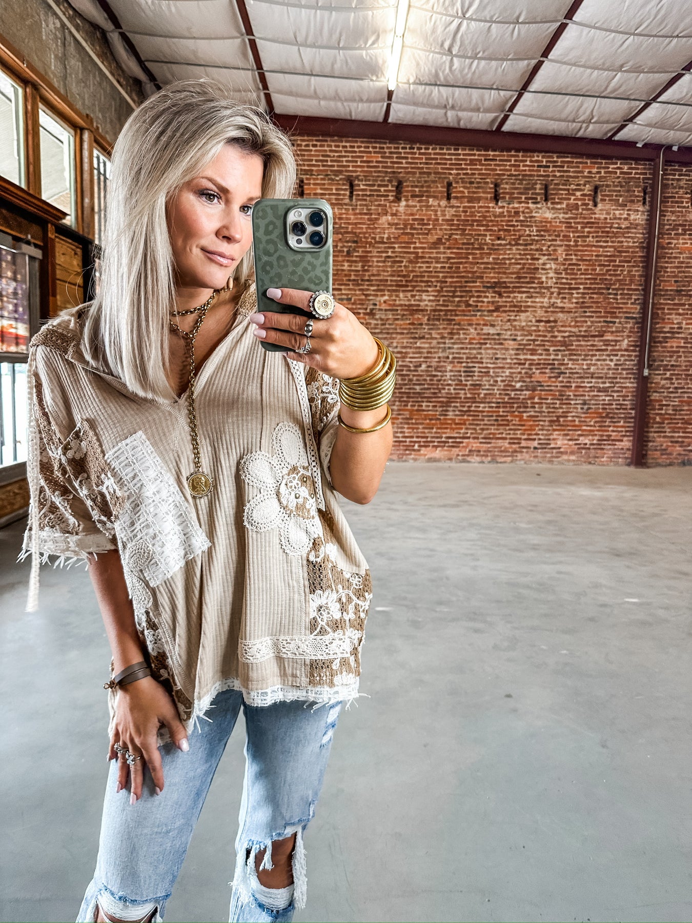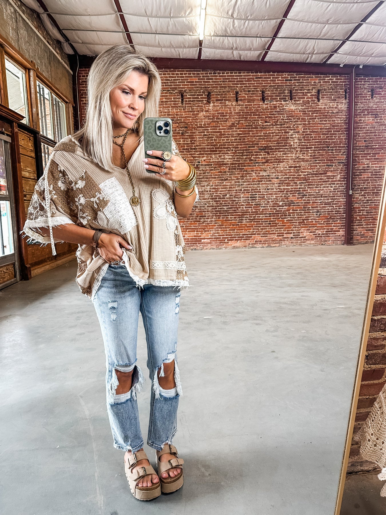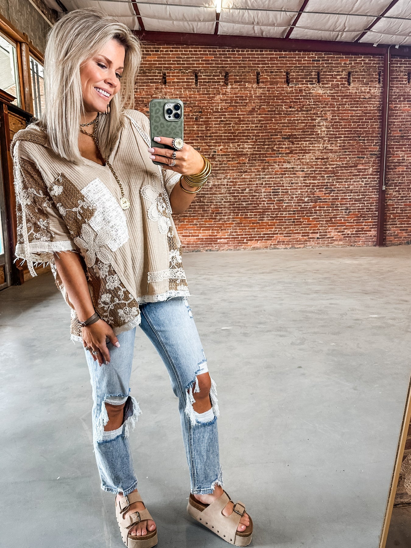This new arrival is giving us all of the high end vibes! It's full of detail and textures. Patchwork, lace, exposed stitching mixed with pops of florals. Relaxed fit with the drawstring and hood feature on the back. Model is wearing her true size small with an oversized fit. Size down if you prefer more true to size.