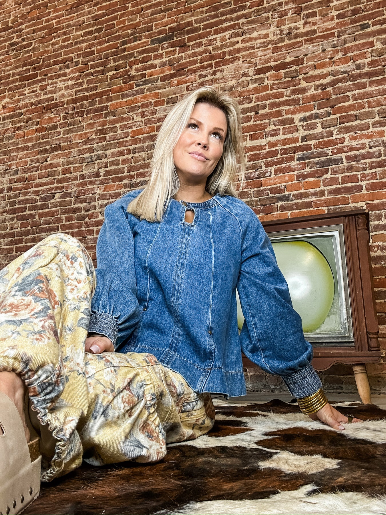 Denim top with a keyhole neckline, bubble sleeves and a flared hem for a fun, flattering shape. Elevated, playful and the kind of piece that instantly makes your outfit feel special. Model is wearing her true size Small with a relaxed fit. No stretch in fabric.