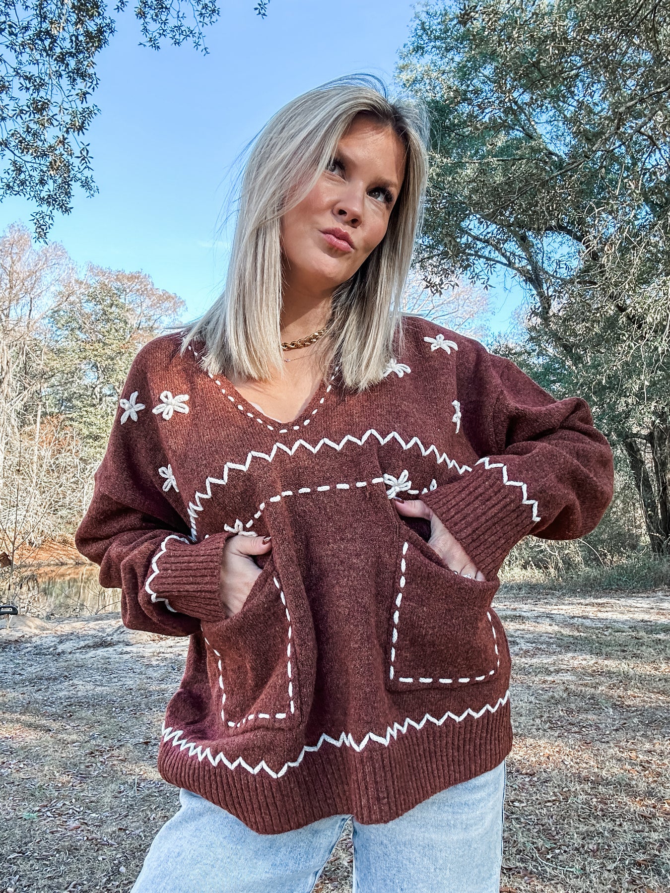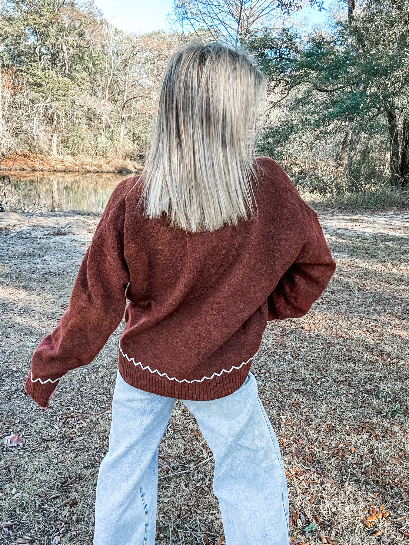 Cozy never looked so cool. This deep rust pullover features chunky ivory stitching that adds texture, contrast and personality. Fun and funky with a timeless feel! It's the perfect layer for everyday wear with a boho edge. Model is wearing her true size Small with a relaxed fit.