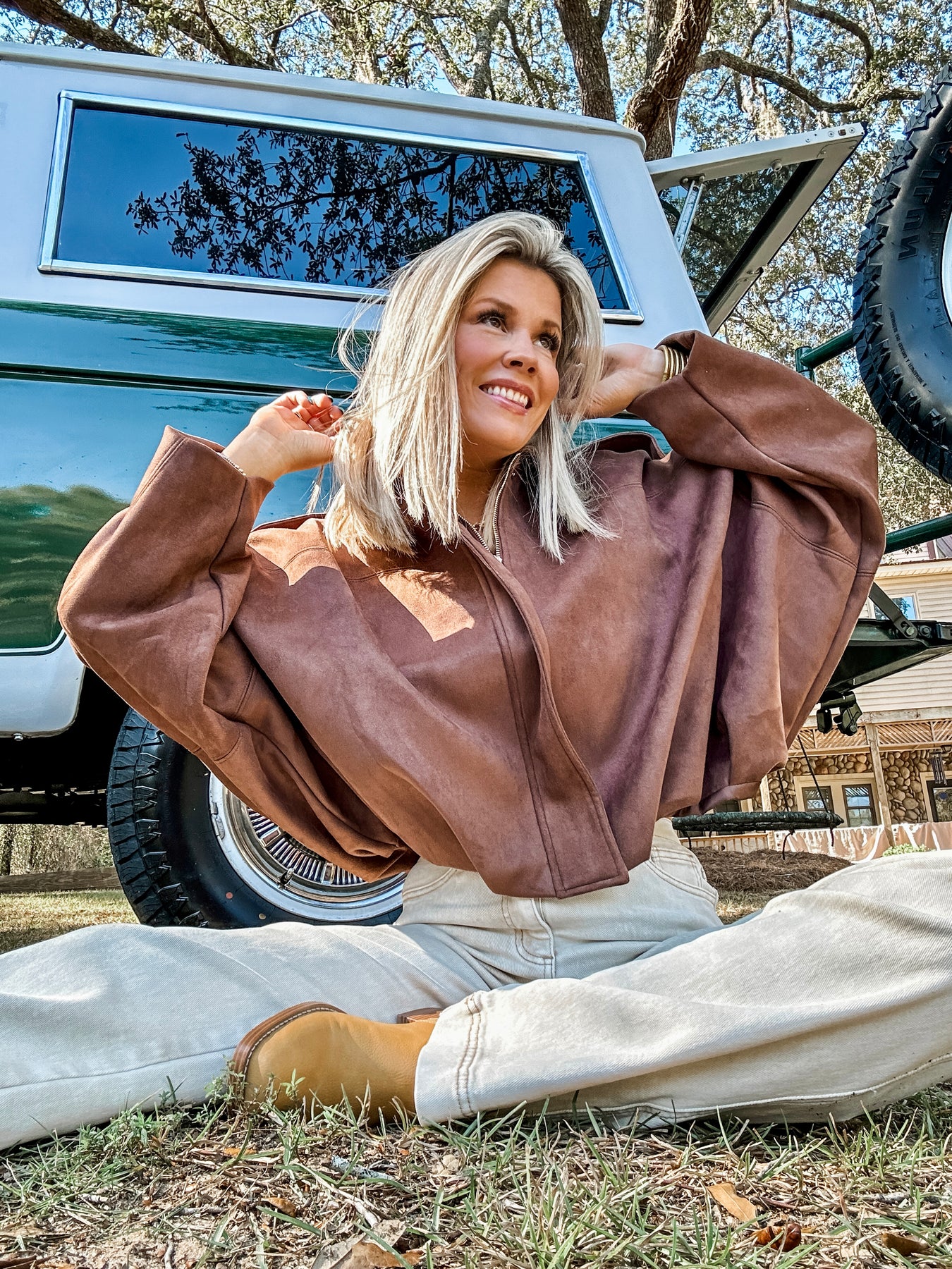 Top trend suede bomber with an oversized fit and gold hardware-perfect for layering, lounging or turning heads wherever you go. This is a lookalike style and we have a feeling it's going to be an instant sellout! Model is wearing her true size Small with a relaxed fit.