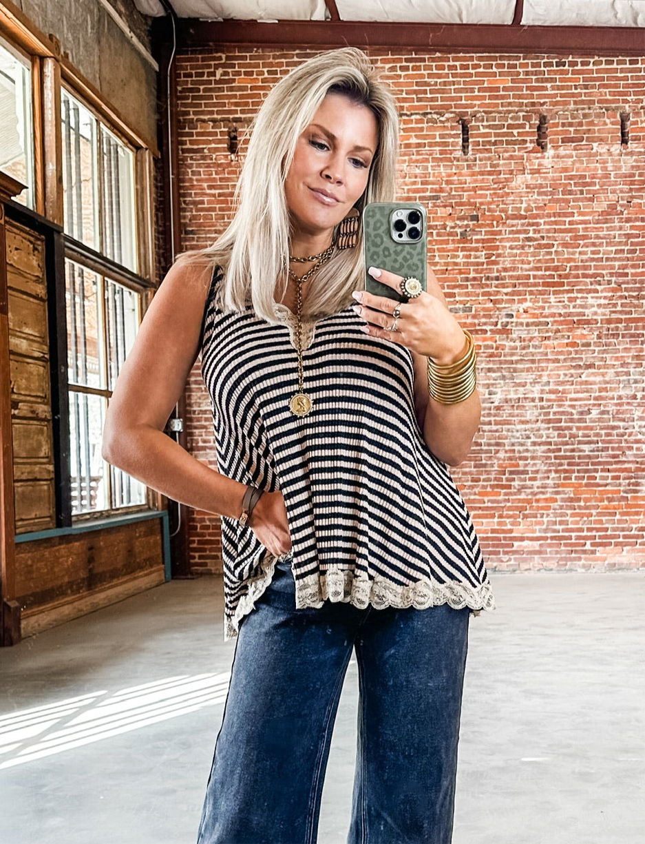 Khaki and black stripe tank with delicate lace trim and a flattering longer length. Finished with a keyhole cutout along the back for a subtle, unexpected detail. Soft, easy and elevated. Perfect for everyday wear while still feeling a little special. Model is wearing her true size Small and layered with a bralette.