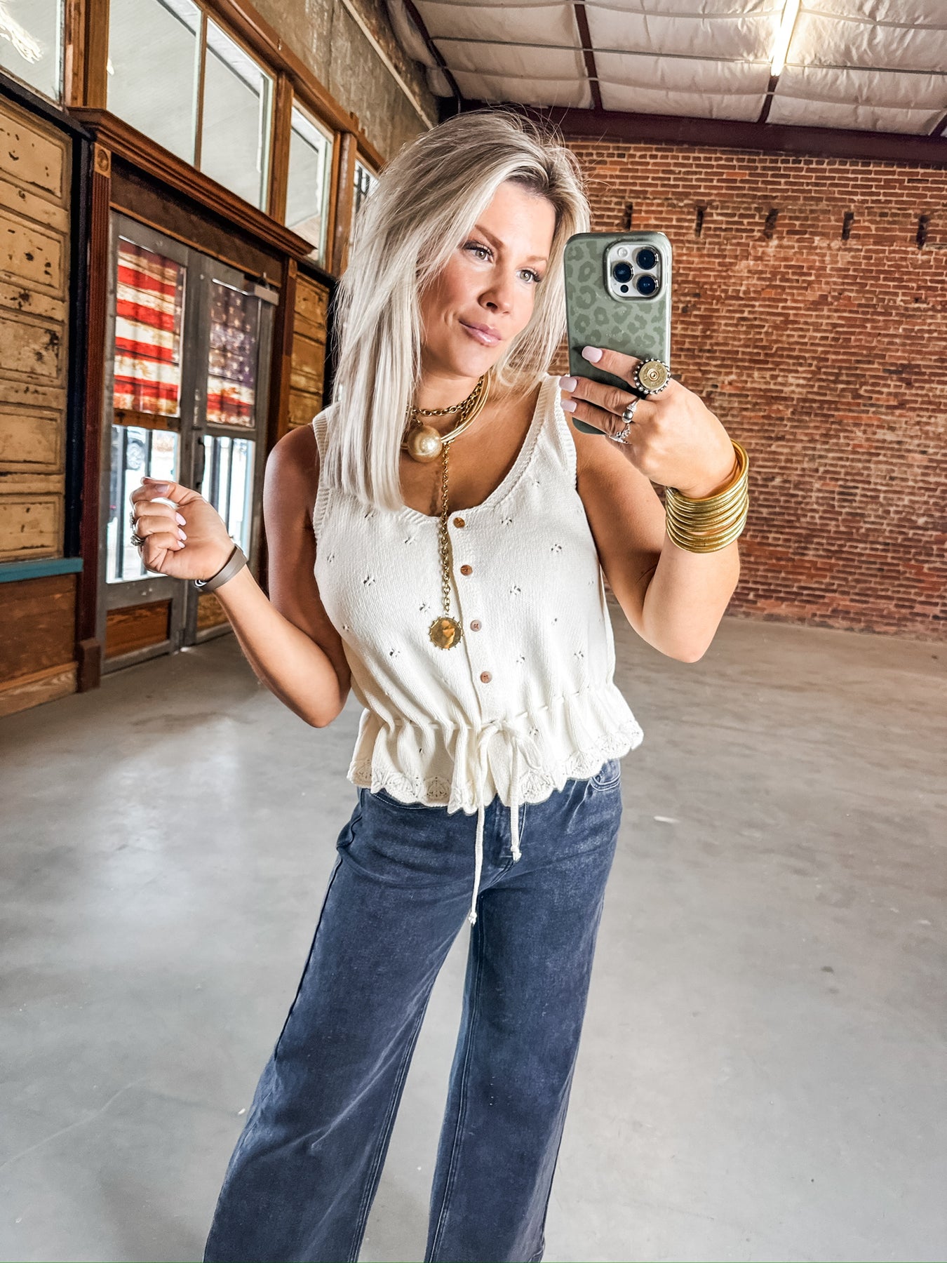 Sweater tank with the sweetest little details. The cinched waist with a functional drawstring is super flattering and the texture adds the perfect touch. Soft, cozy and easy to wear with a simple body that still feels special. Model is wearing her true size Small.