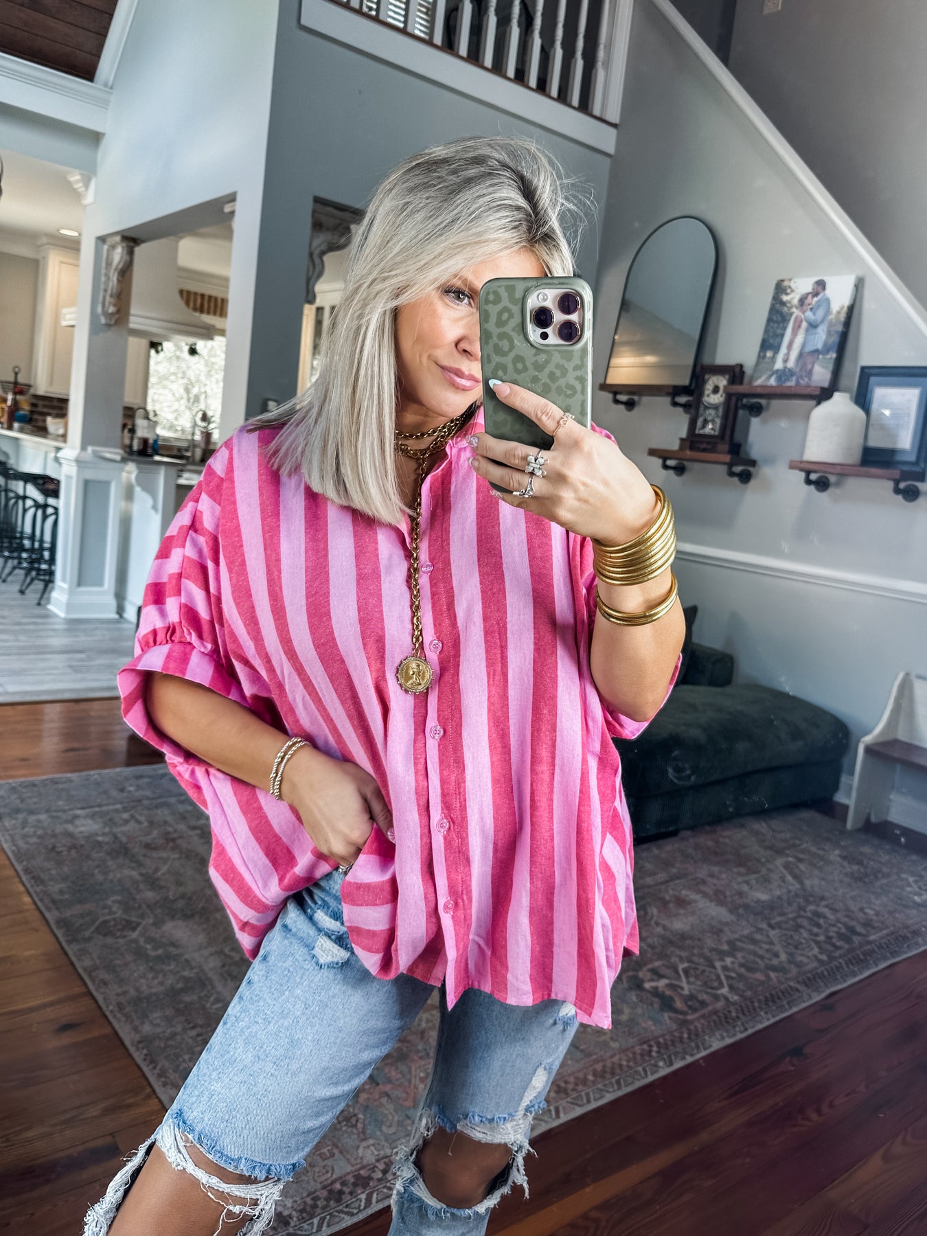 A pink and red washed striped top that makes getting dressed effortless! Relaxed fit with functional buttons and a longer length in back. Pair it with white denim for a fun pop of color! Model is wearing her true size Small with a relaxed fit!