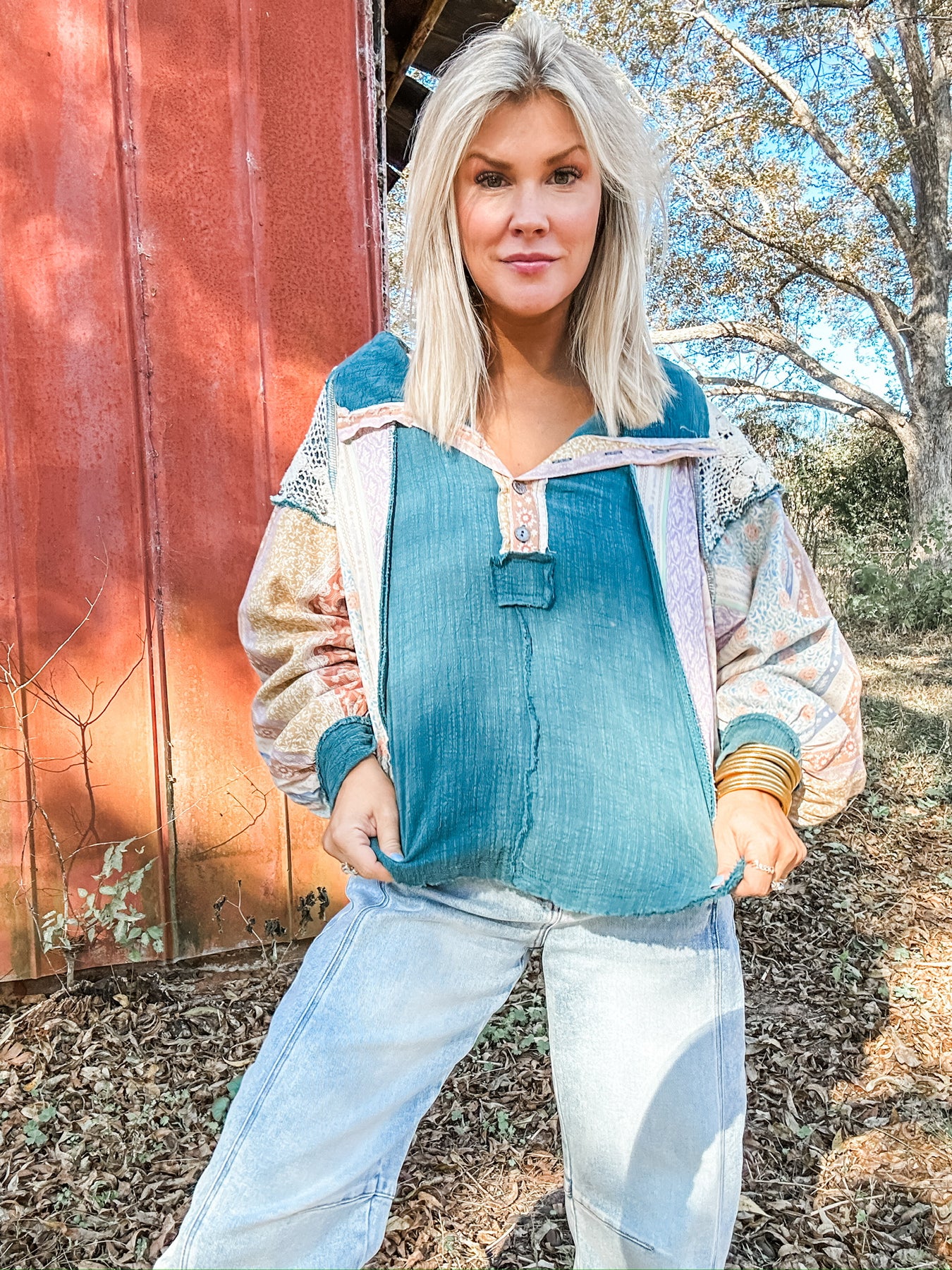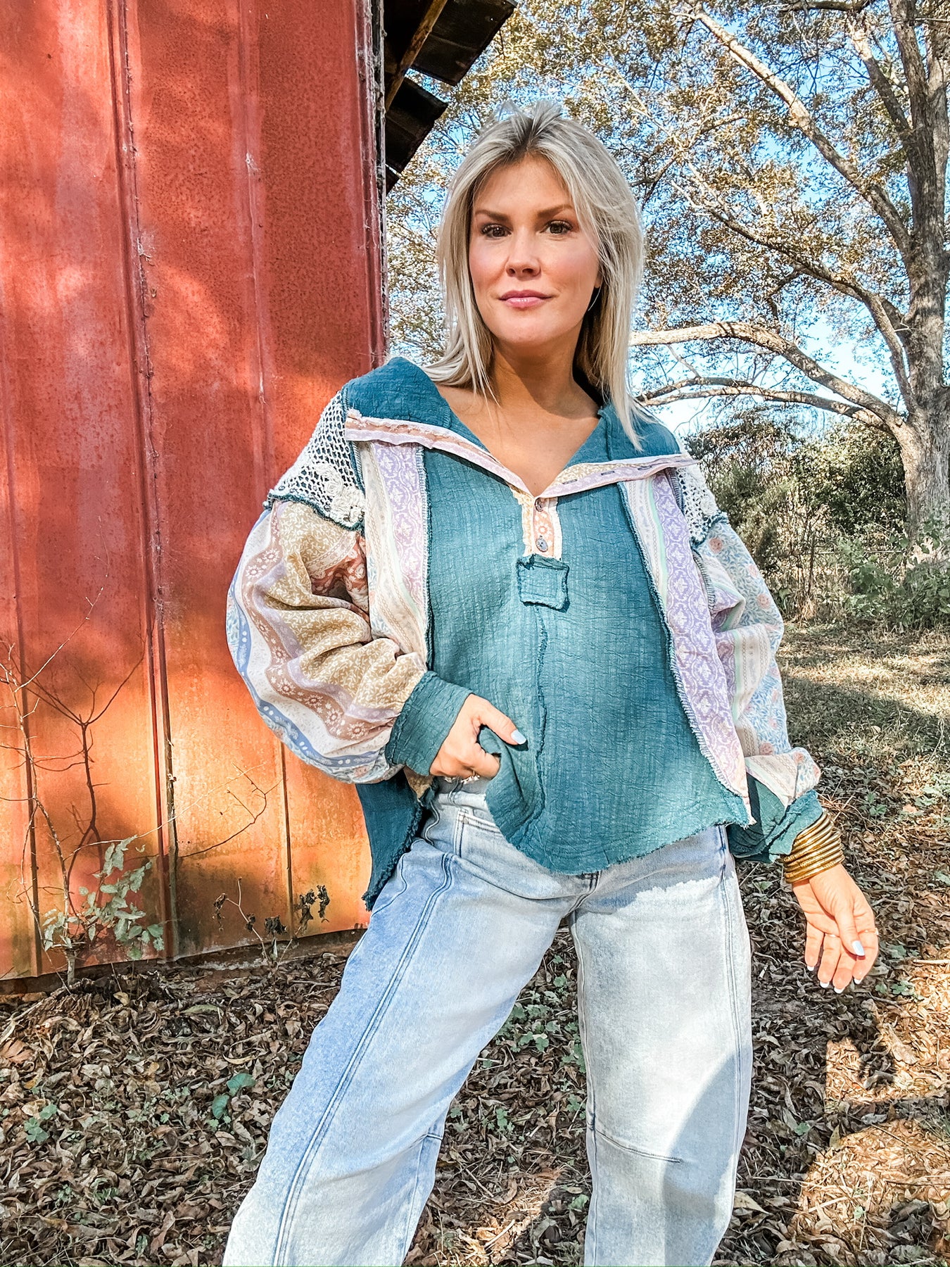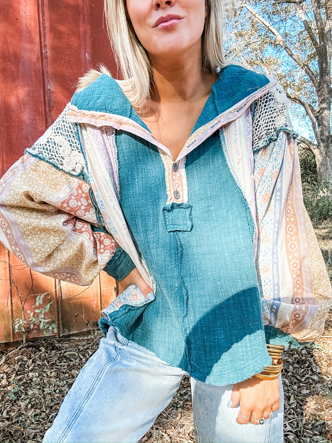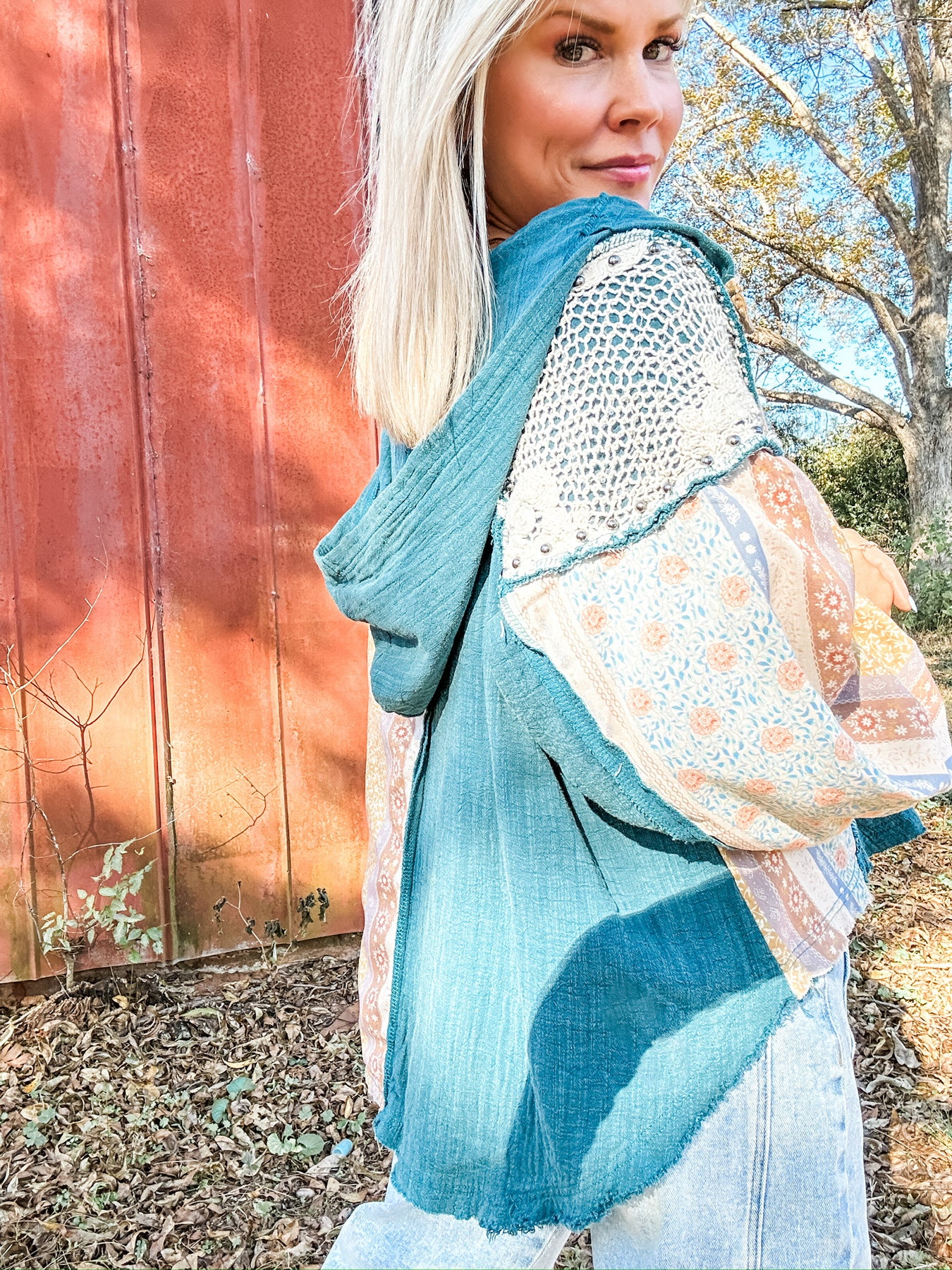 This teal cotton gauze beauty brings all the texture with lace grommets and multicolored accents! Easy, flowy and full of charm. It's the ideal splash of color when the weather turns cold. Model is wearing her true size Small with a very relaxed fit. Feel free to size down for a more true to size fit!