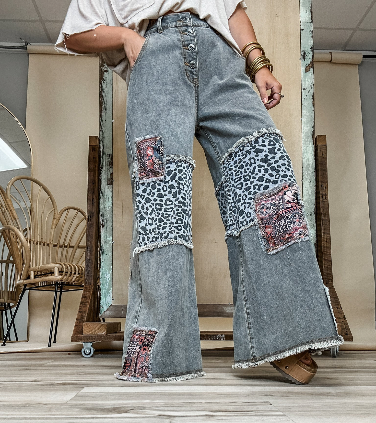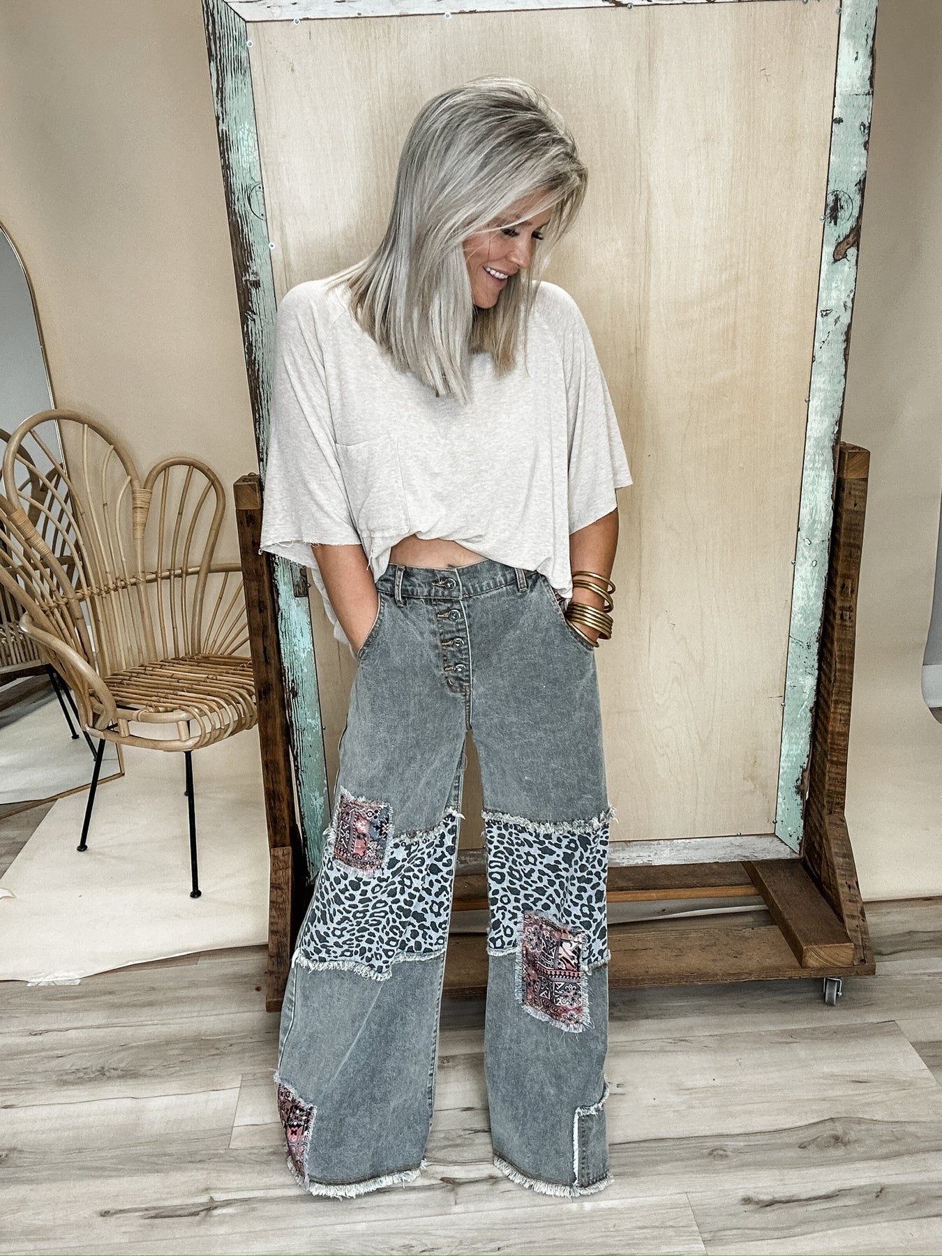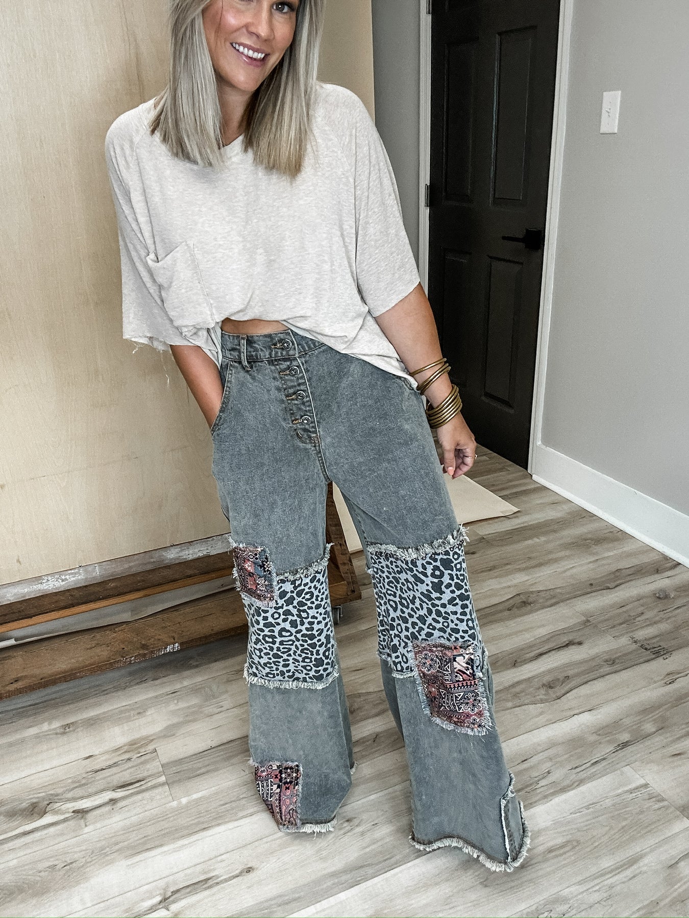 Easygoing with just the right amount of edge! These charcoal-washed bottoms are fill of personality. The button fly front and wide leg fit give off vintage vibes, while raw hems and patchwork details keep things cool and a little unexpected. Soft, lived in denim makes them feel like an old favorite from the first wear. Style with a tee and sneakers or boots and layers in the cooler weather. Model is wearing her true size Small with a relaxed fit!