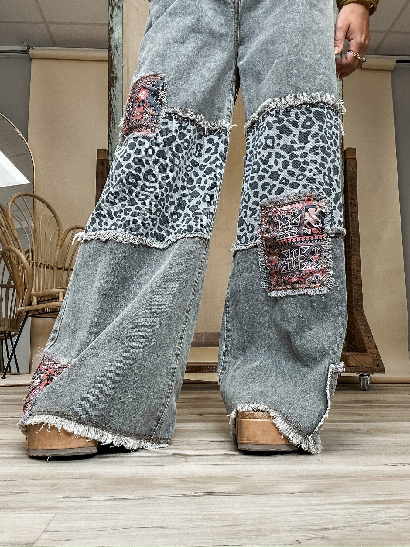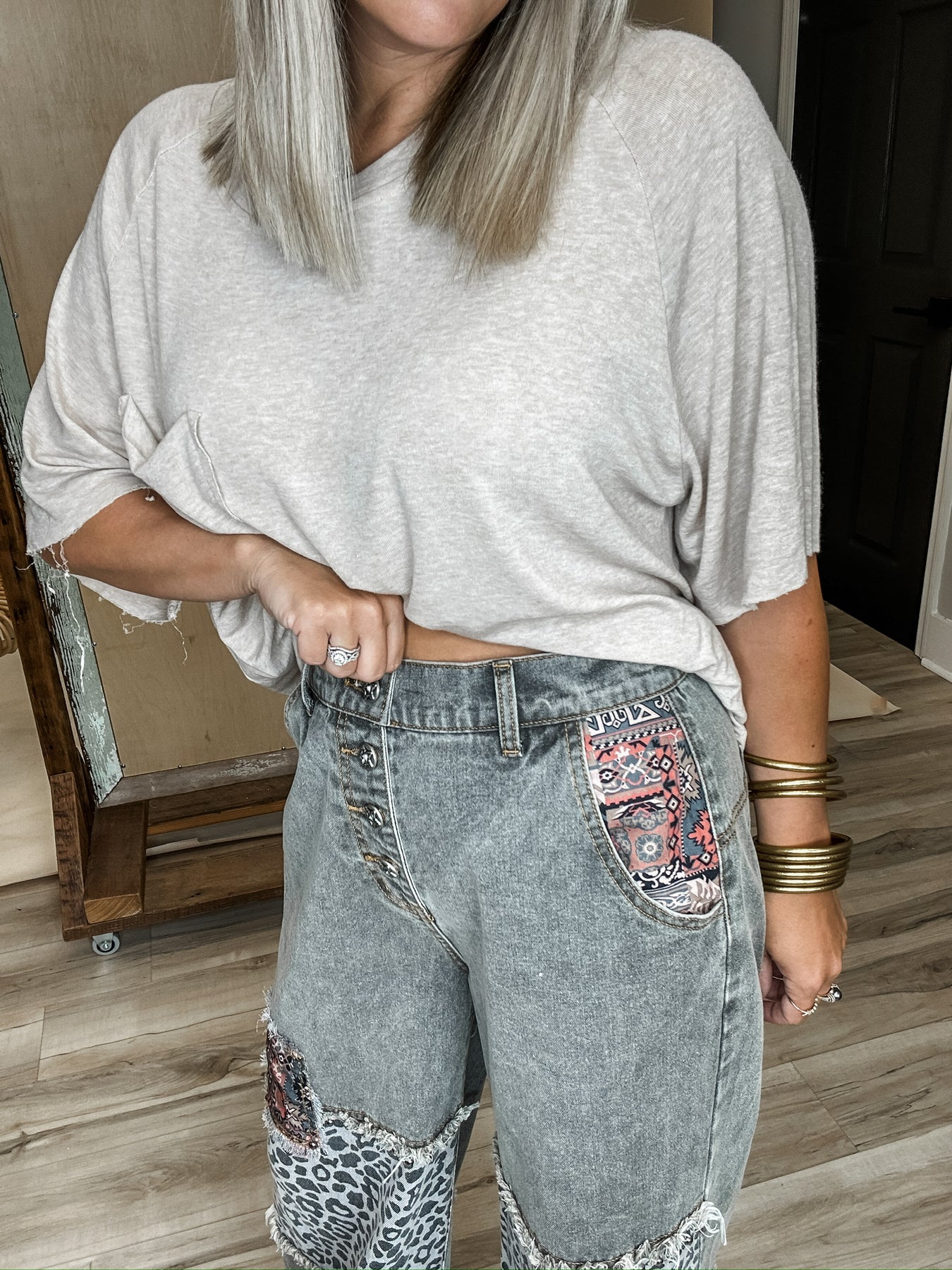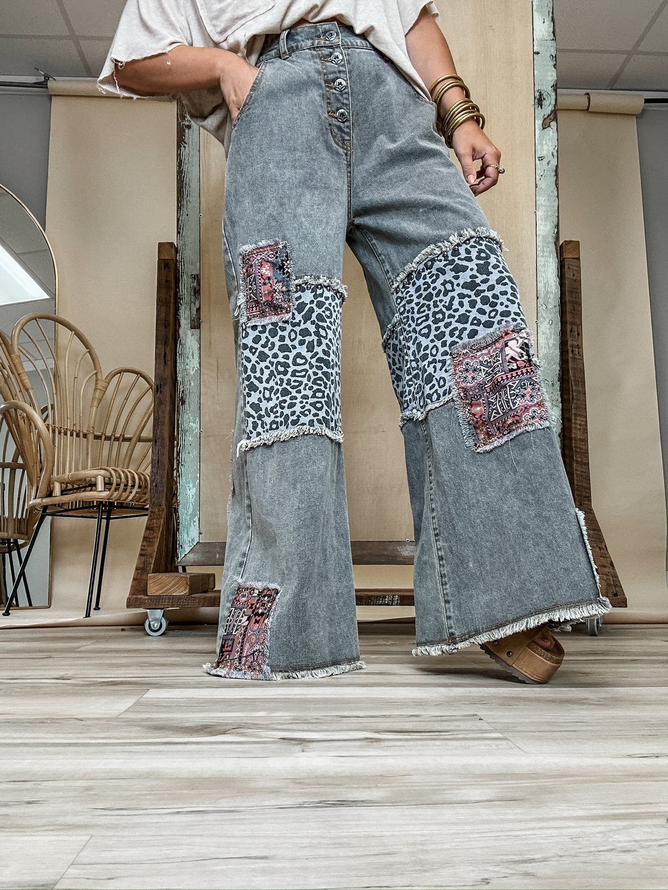 Easygoing with just the right amount of edge! These charcoal-washed bottoms are fill of personality. The button fly front and wide leg fit give off vintage vibes, while raw hems and patchwork details keep things cool and a little unexpected. Soft, lived in denim makes them feel like an old favorite from the first wear. Style with a tee and sneakers or boots and layers in the cooler weather. Model is wearing her true size Small with a relaxed fit!