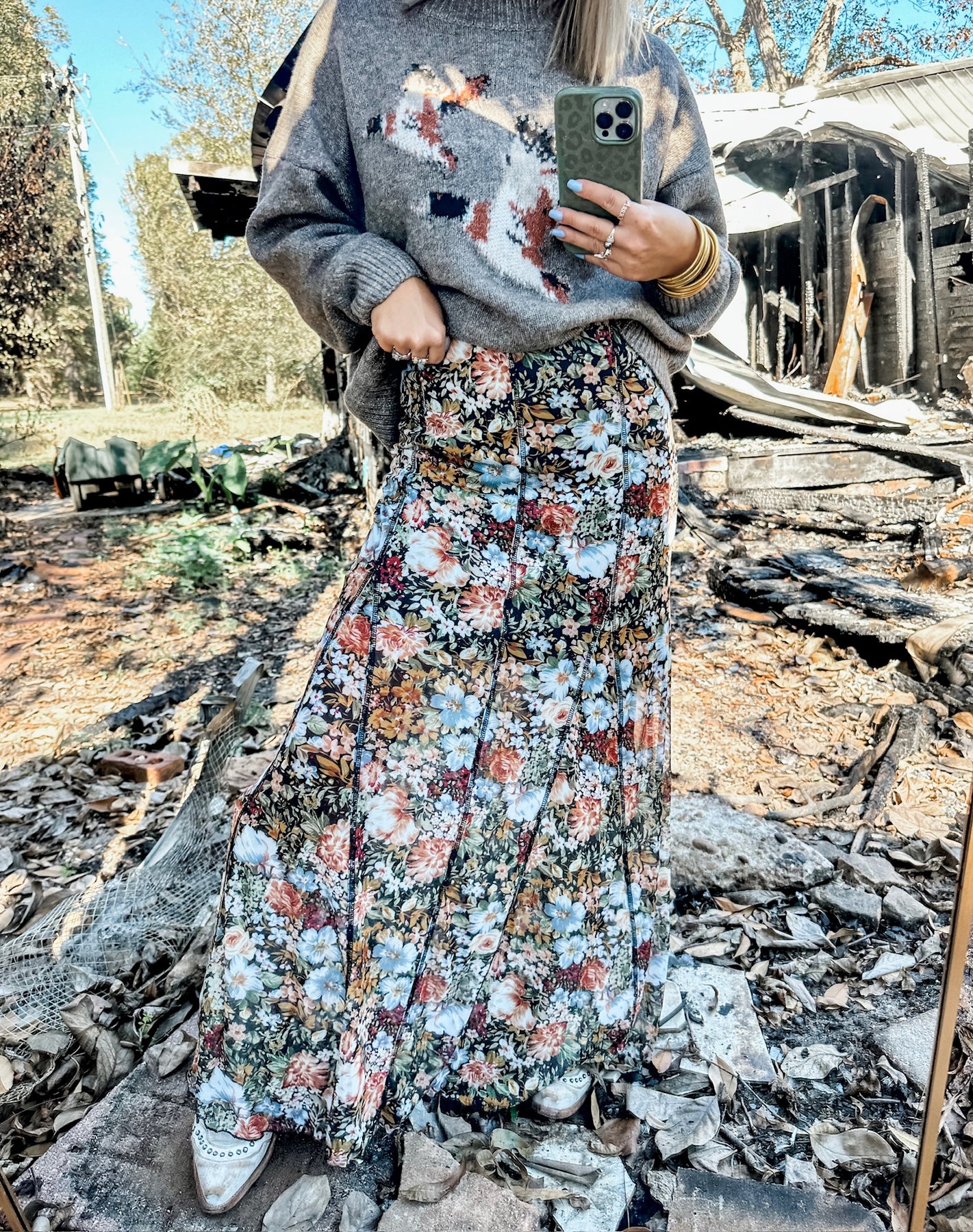Keep it easy and fun with this flared mesh-like skirt. Stretchy and comfy with an elastic waistband, it’s perfect for dressing up with a cozy sweater or keeping casual with a graphic tee. The floral print adds a touch of boho vibes to any everyday outfit! Model is wearing her true size Small with a true to size fit.