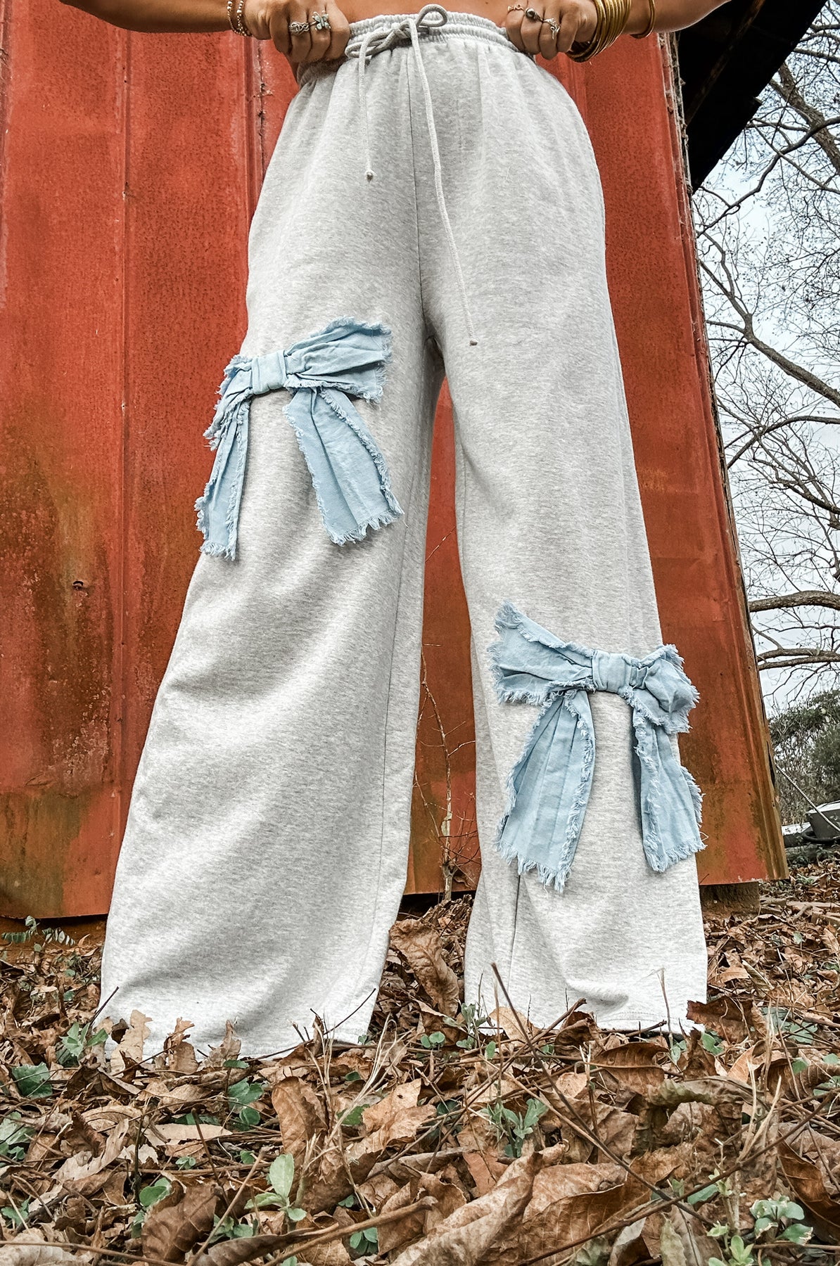 Cozy meets statement! These charcoal wide leg sweatpants bring ultimate comfort with a relaxed fit and functional elastic drawstring. The denim textured bow with raw edges adds a playful, unexpected twist. Perfect for lounging or dressing up-they are so much fun! Model is 5'2" and is wearing her true size Small with a relaxed fit.