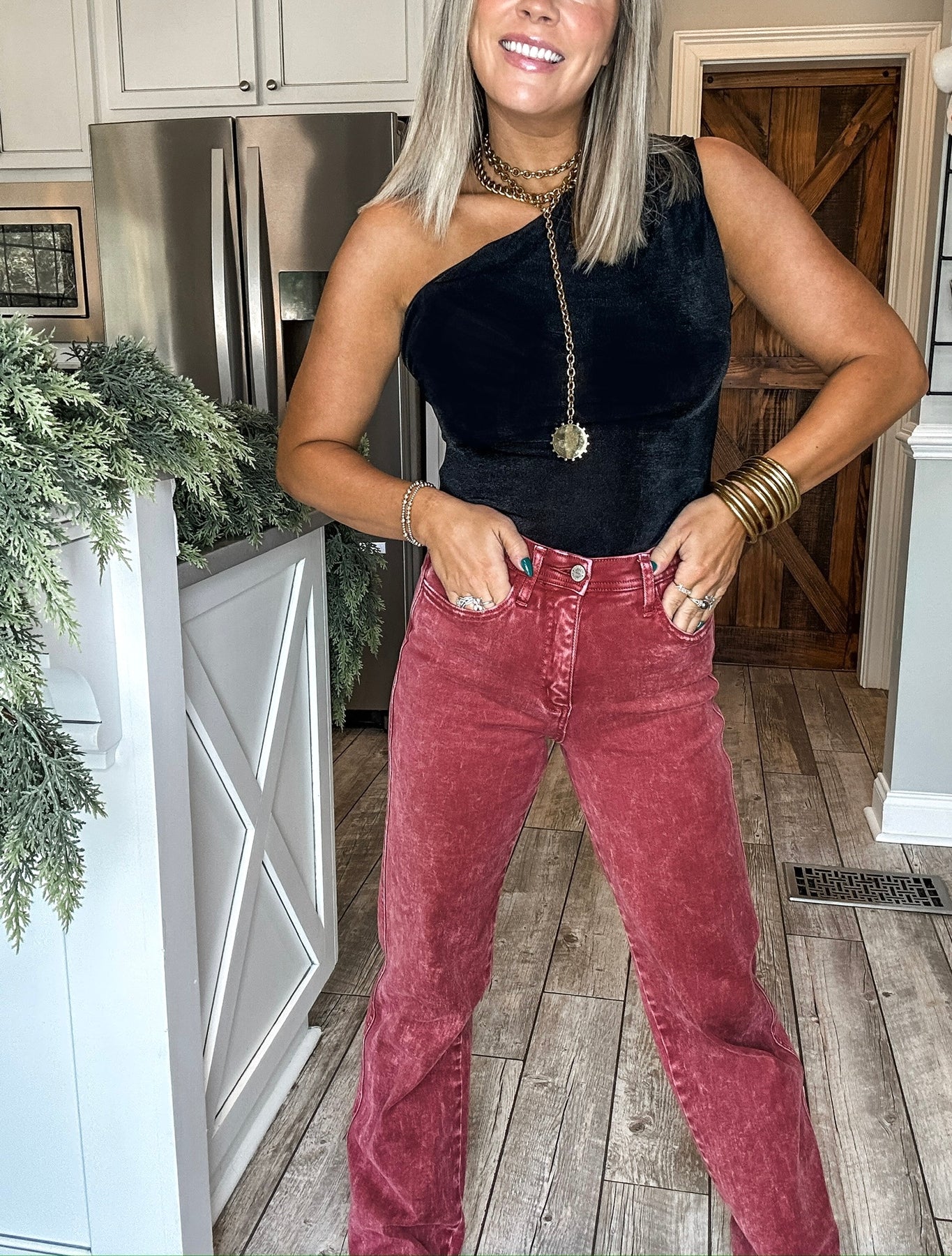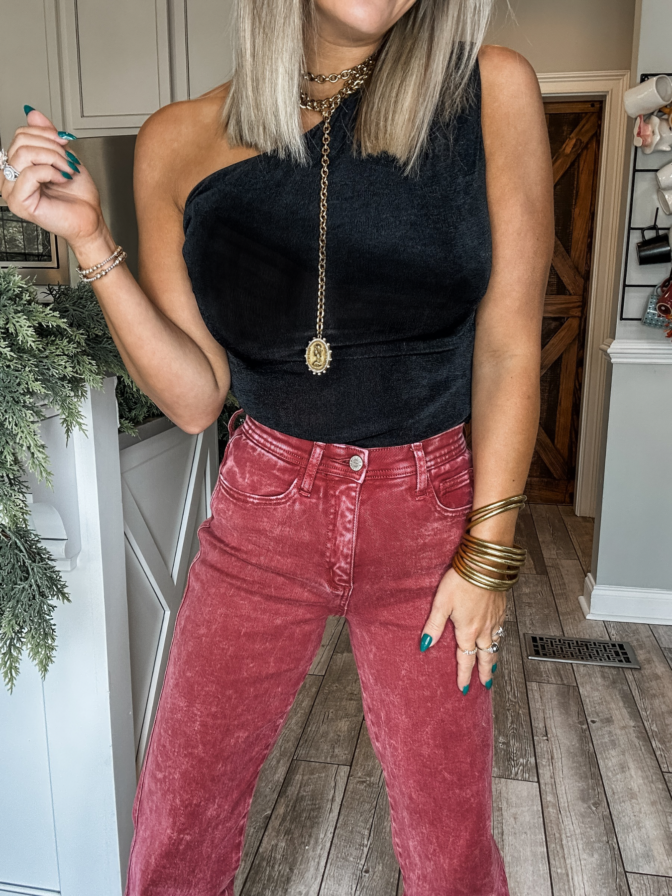 Shine all night in this metallic one shoulder bodysuit! True to size fit, snap closure and sleek design make it perfect for holiday parties or fun date nights! Model is wearing her true size Small.