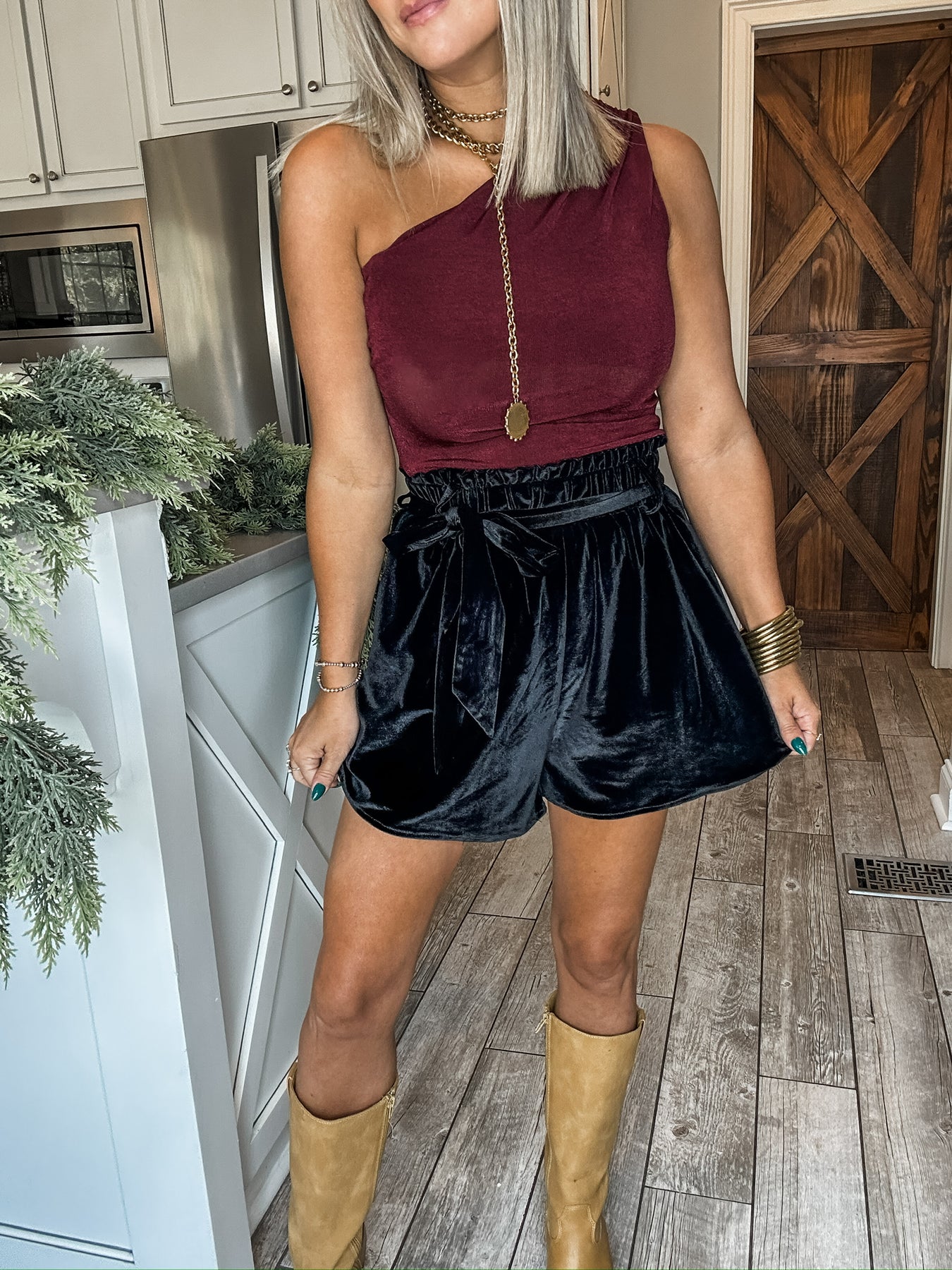 Twirl into the Holiday season with these flowy velvet shorts! With a flattering flare, self-tie chunky belt and functional belt loops-they’re perfect for dressing up or keeping it casual. Luxe, comfy and totally festive ready! Model is 5’2” and is wearing the size Small.