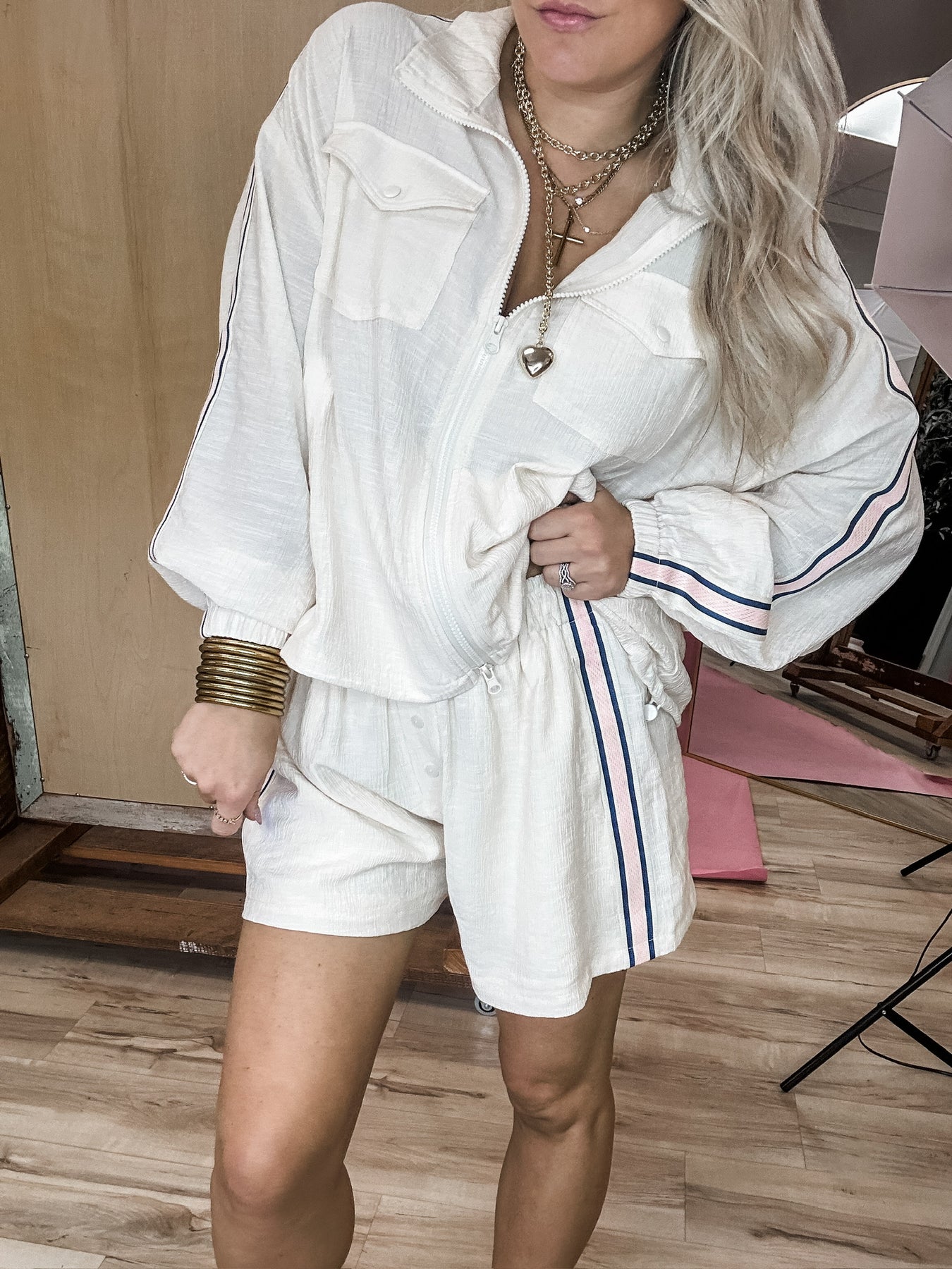 This set is packed full of details! Cream body with a pink and navy trim. Functional zipper and drawstring waist on the jacket. Elastic waistband with the cutest boxer button details on the shorts. Relaxed fit on both pieces. Wear alone or layer up! Model has on her true size small with a relaxed fit.