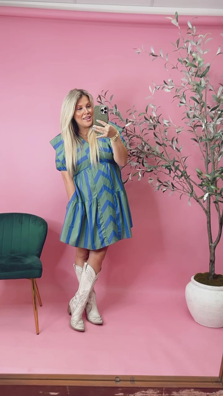 This dress is funky, but we are obsessed! The green and blue combo mixed with the stripe variations is so fun! This dress has ruffled shoulders with a tiered skirt. Pair this with sandals while it is still warm or style with booties for the Fall! Oh, and we can't forget about the pockets! Model is 5'2" and is in her true size small with a relaxed fit.