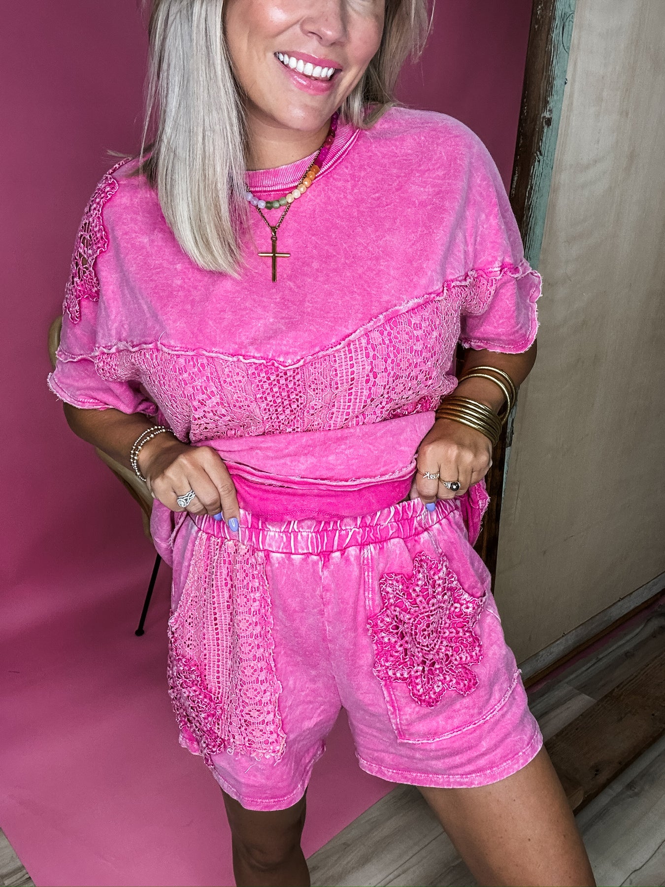 This set checks the boxes for comfy and cute! Tons of texture details that include lace and patchwork. The color and mineral wash make such a pretty combo! It is sold as a set, but can easily be broken apart to make several looks. Relaxed fit, but not too oversized. Model is wearing her true size Small.