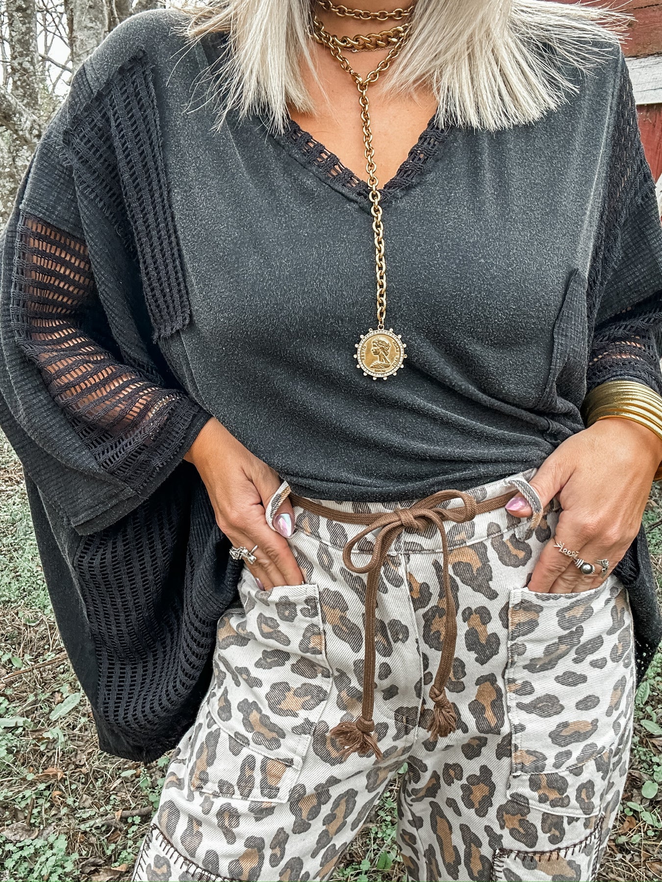 These barrels are a best seller at HIB! And this is a brand new point. Throw on a solid or graphic for the cutest fit! True to size fit in the waist with a true zipper and button closure and the chunky rope belt. Barrel leg with the cutest patchwork and exposed stitching. Model is 5'2" and is wearing her true size Small.