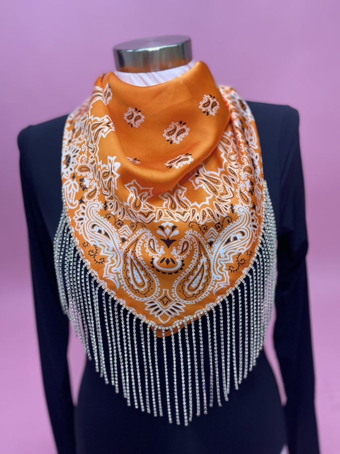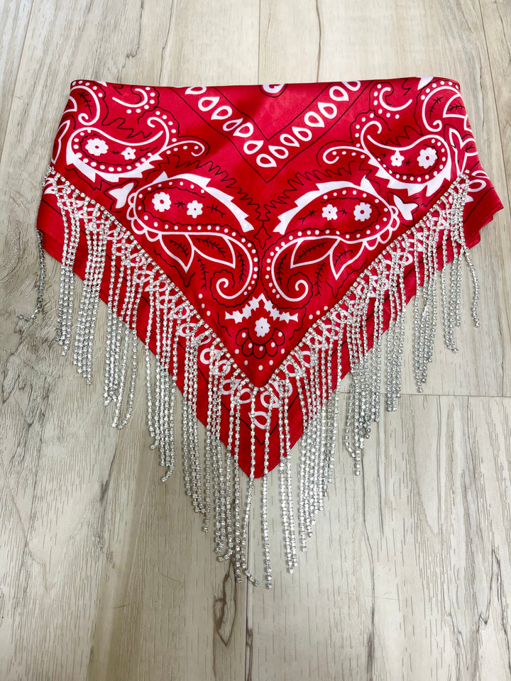 Blingdanas have been trending!! These are so cute to accessorize any outfit! The classic bandana with the rhinestone fringe to have some personality! This one is even better because it is a silk material!