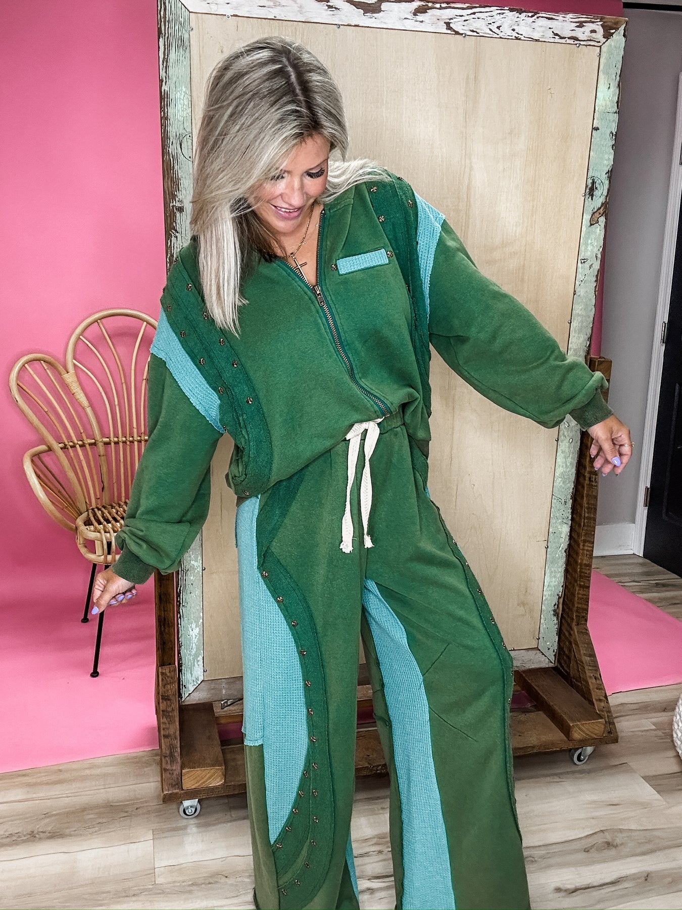 Bold yet timeless, The Emerald Era Set is where rich color meets elevated edge. A deep emerald green mixed with hints of turquoise creates a vibe to turn heads without saying a word. Crafted from a mix of contrasting textures and premium fabrics, this set plays with structure and flow. Stud accents add a touch of grit, while raw edges give it an undone, effortless finish. Every detail is intentional and we are in love! Model is wearing her true size Small with a very relaxed fit. *The restock is in transit! Please allow a few extra days for fulfillment.
