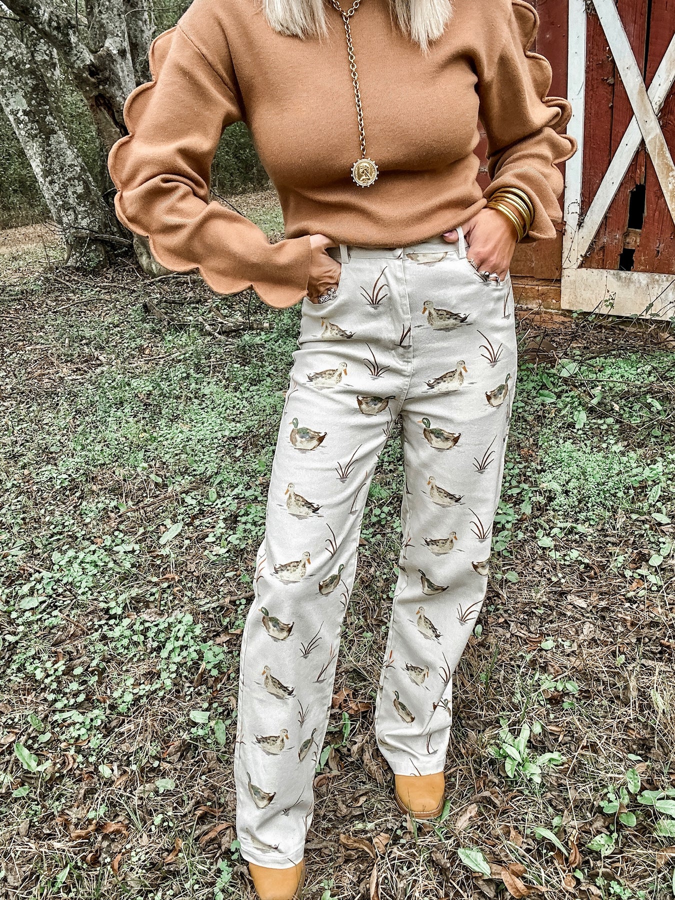 Soft khaki tones meet nostalgic duck print for the perfect vintage inspired bottoms! A straight leg fit with just the right stretch keeps them flattering and comfy, while functional pockets make them practical and wearable. Unique, charming and so much fun to style! Model is wearing her true size Small.