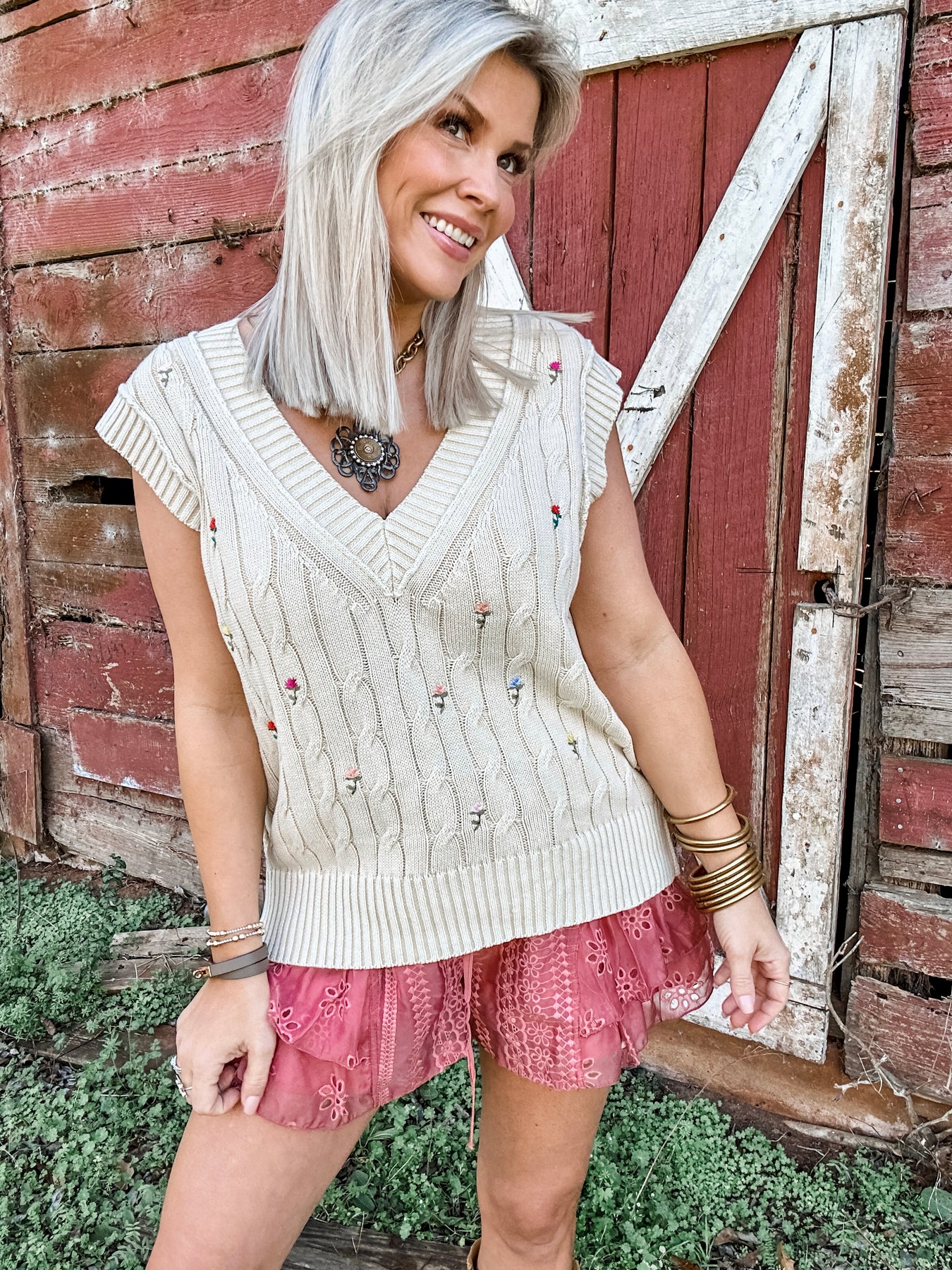 This sweater vest top has all the vintage charm! The embroidered flowers give it that old school, collected feel while the knit has tons of depth and texture. The v neckline keeps it flattering and easy to style. Wear it on its own for a standout look or layer it over a fitted tee or long sleeve for that effortless, styled vibe. It’s classic with a fun little twist. Model is wearing her true size Small with a relaxed fit.