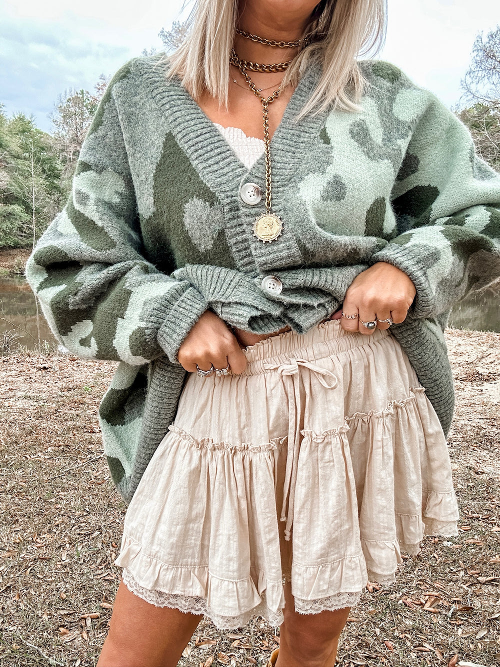 Closet staple status! A neutral skirt you will reach for again and again. Ruffled tiers, the perfect texture and beautiful lace trim. It's easy to style and so versatile. Elastic waistband and amazing quality. Model is 5'2" and is wearing her true size Small.